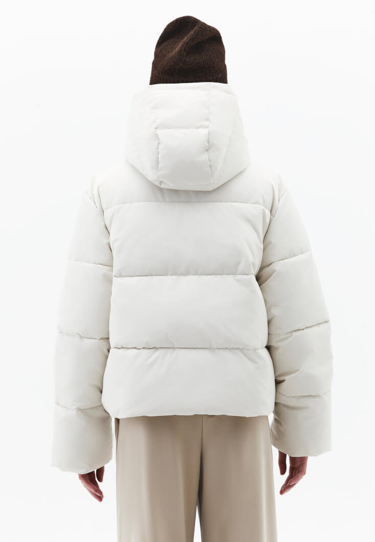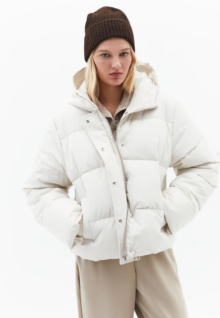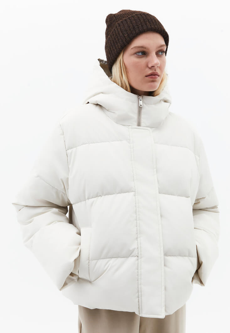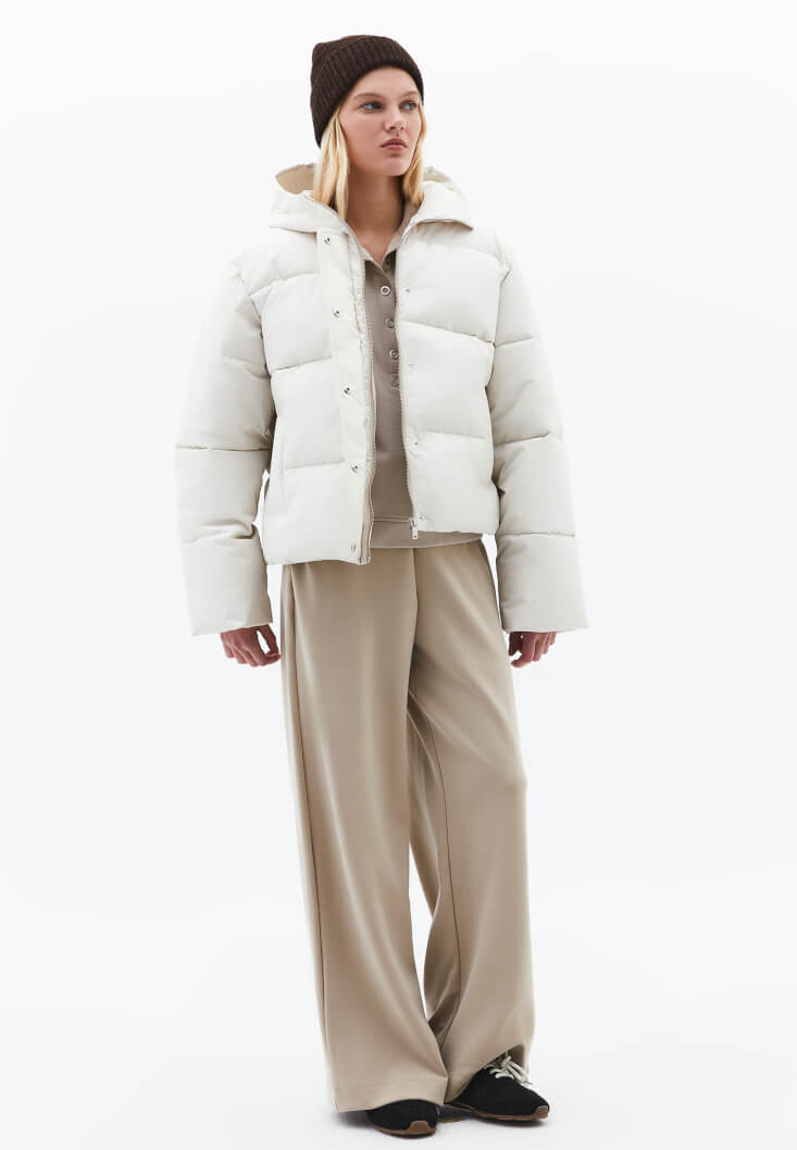 İçi puf dolgulu, kapitone dikişli, özel su geçirmez doku, bedenden uzak loose fit, fermuar ve çıtçıt kapamalı, kapüşon detaylı, yüksek yaka, iki cepli, kol ucu triko lastikli.