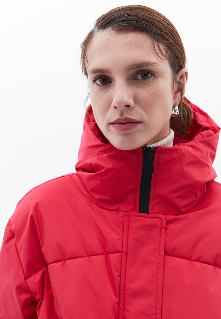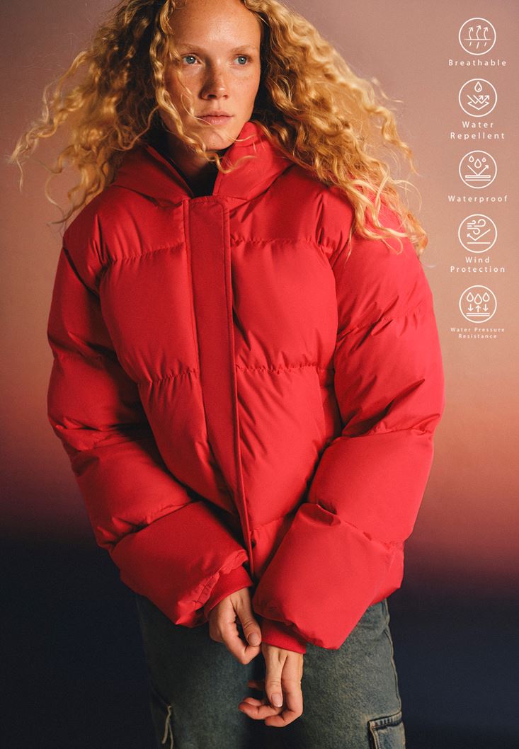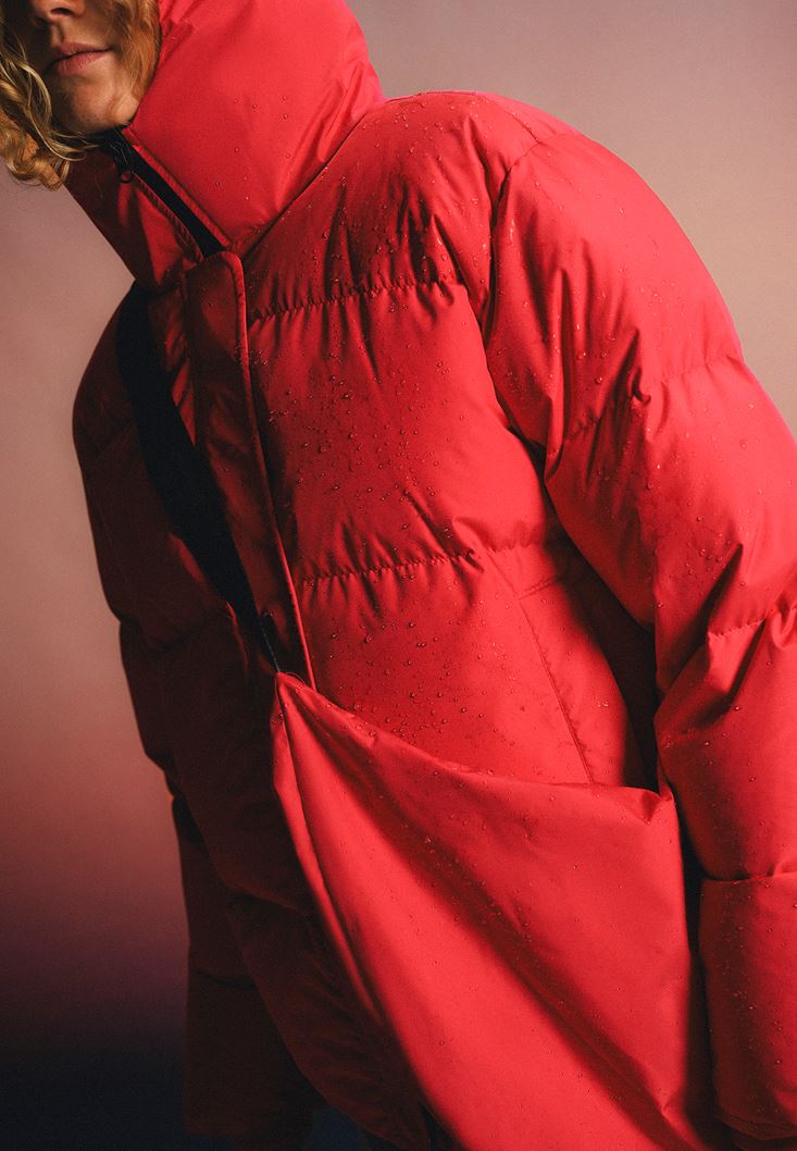 Nefes alabilen kumaş, ekstra su geçirmez özellikli doku, rüzgara ve su basıncına dayanıklı özel tasarım, içi dolgulu puf doku, yüksek yaka, fermuar ve çıtçıt kapamalı, iki cepli, kapitone dikişli, çapraz askılı çanta detaylı.