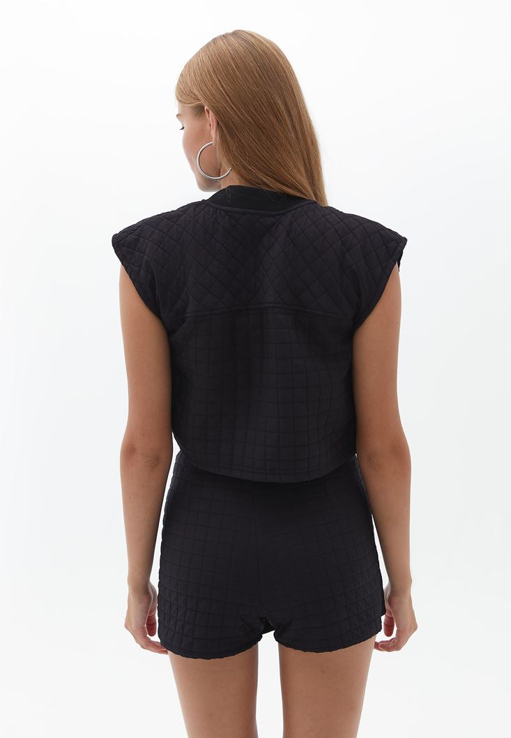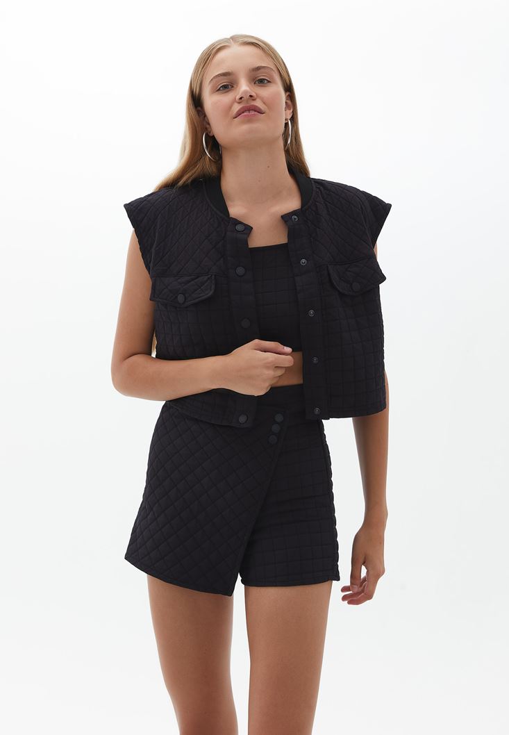 Özel kapitone doku, bedenden uzak fit, crop kesim, çıtçıt kapamalı, üst kısmı cep görünümlü.