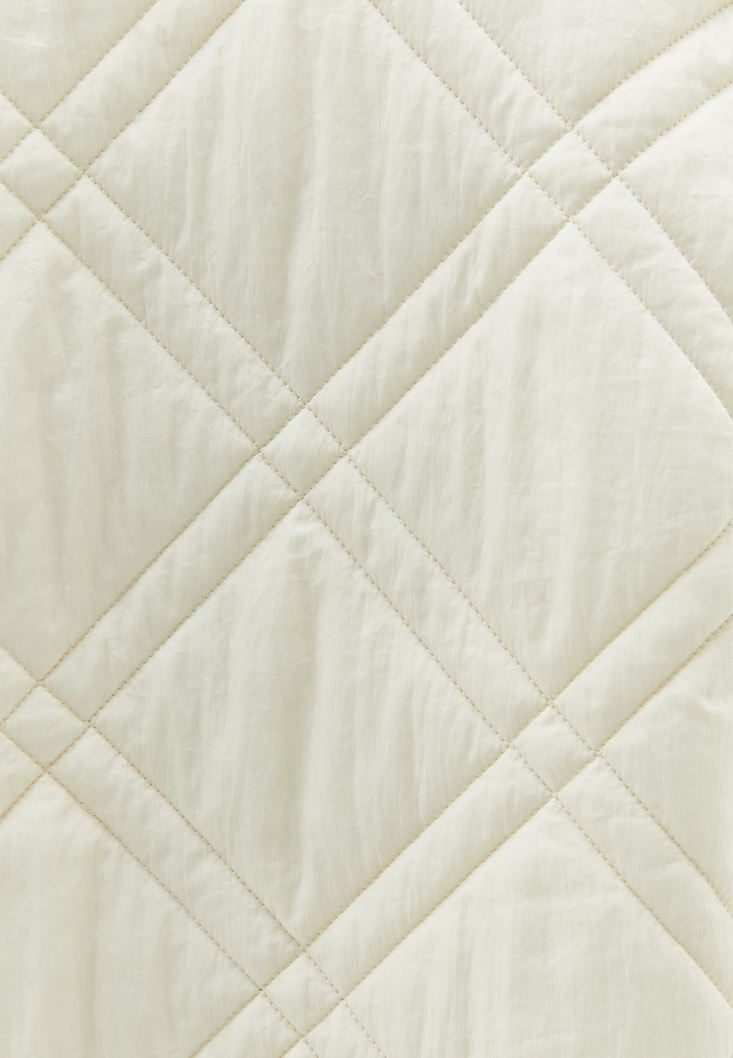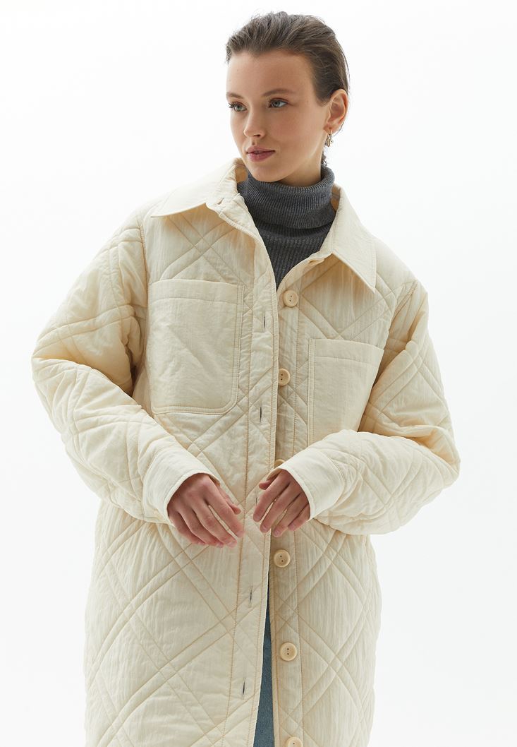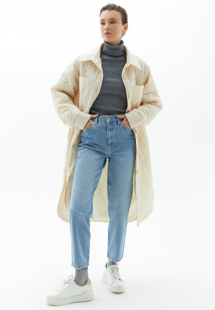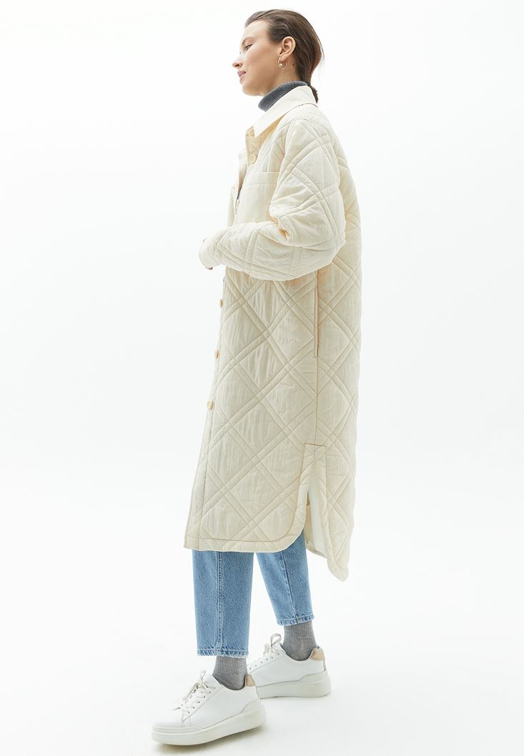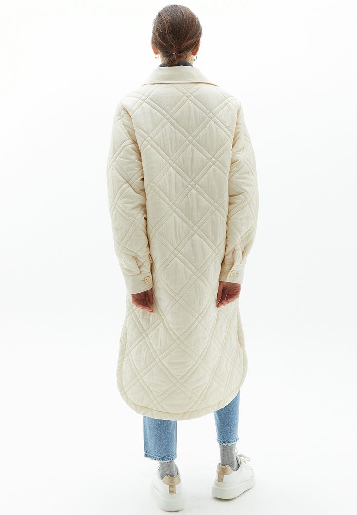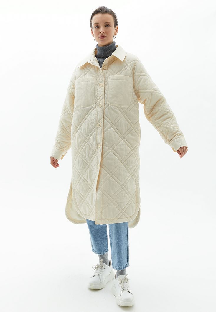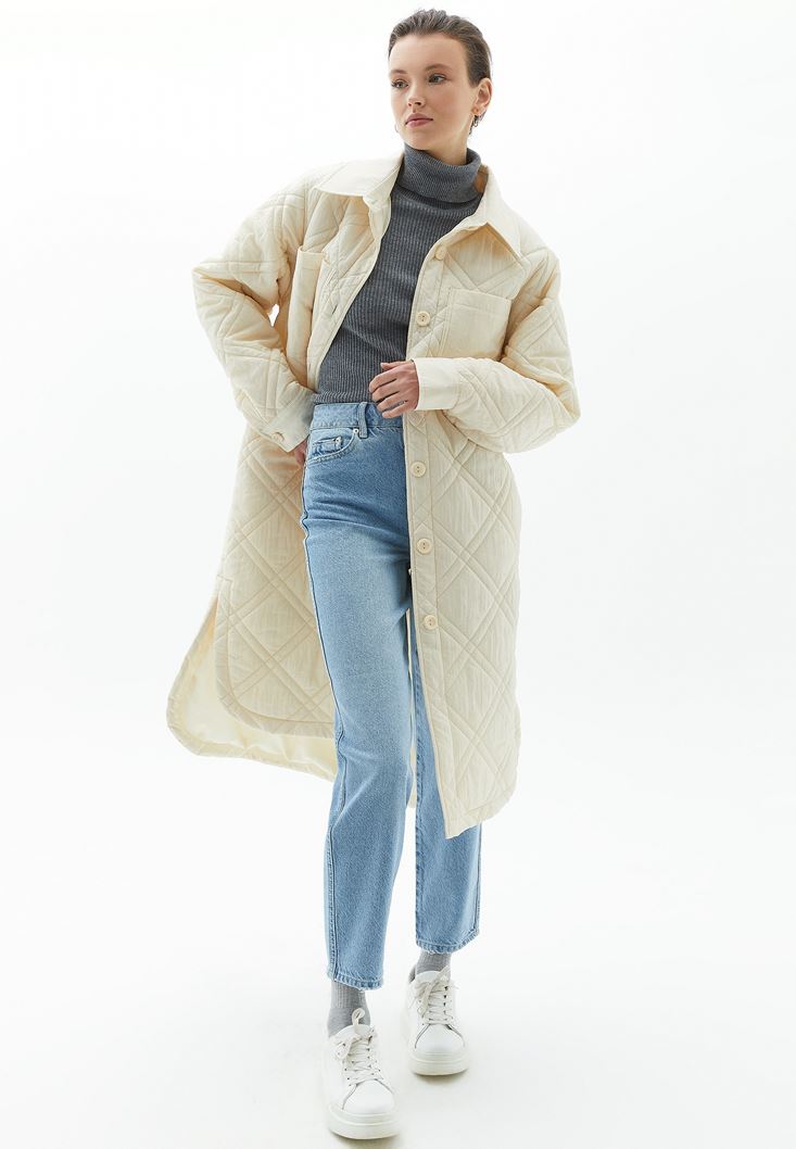 Kapitone dikişli doku, bedenden uzak oversize fit, üst ve alt kısmı ikişer cepli, düğme kapamalı, önü kısa arkası uzun asimetrik kesim, iki yanı yırtmaçlı.