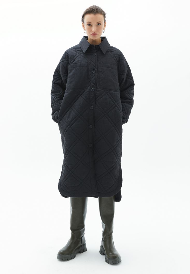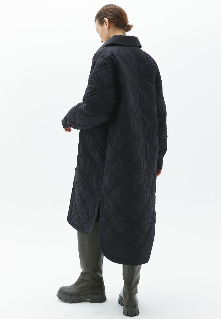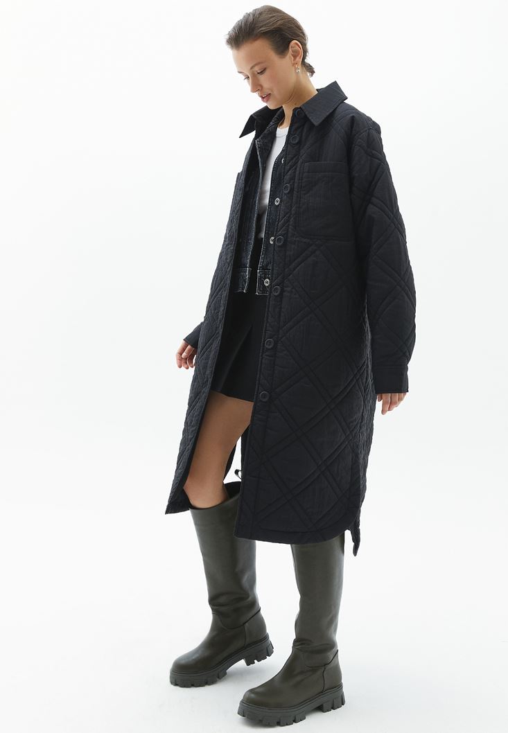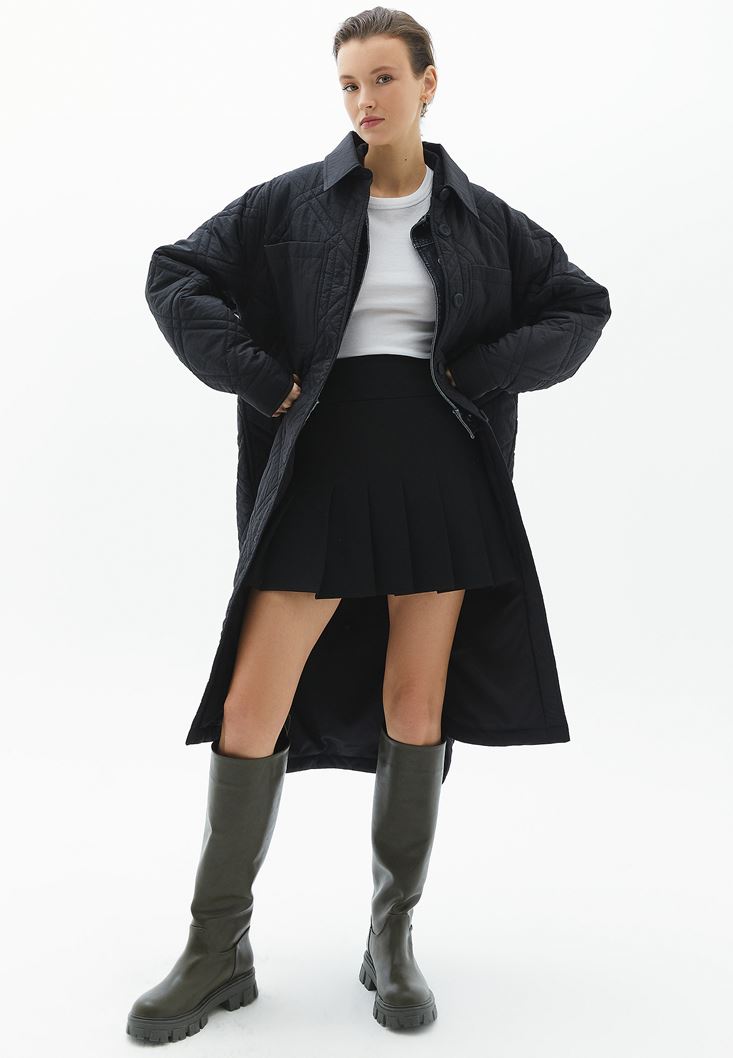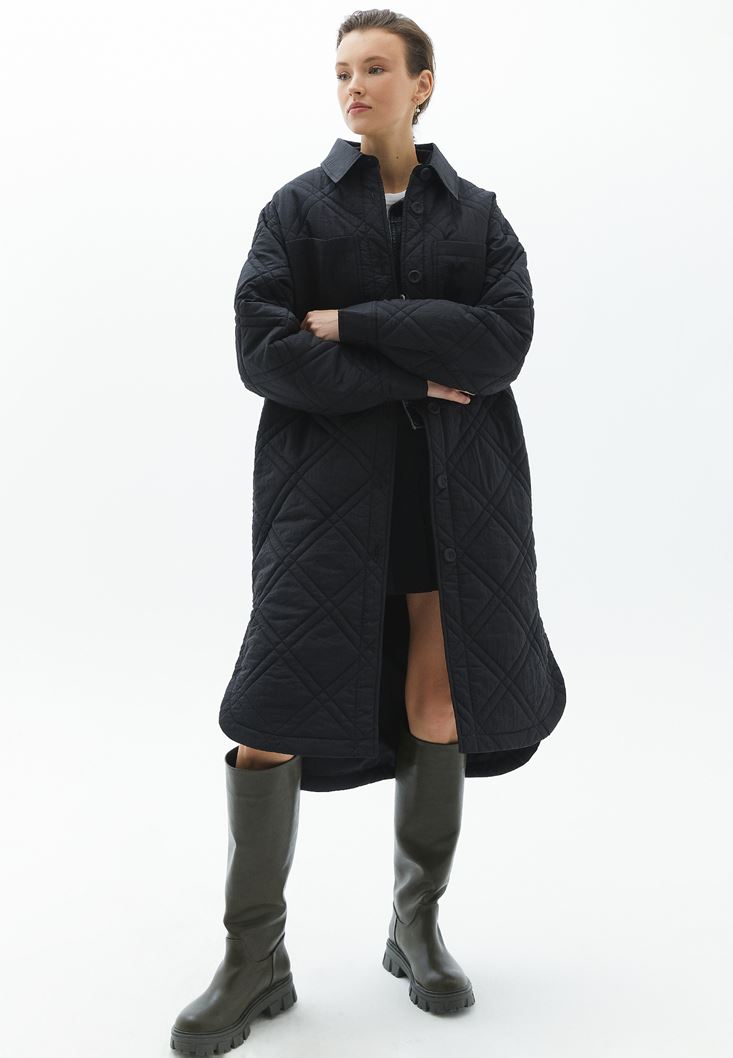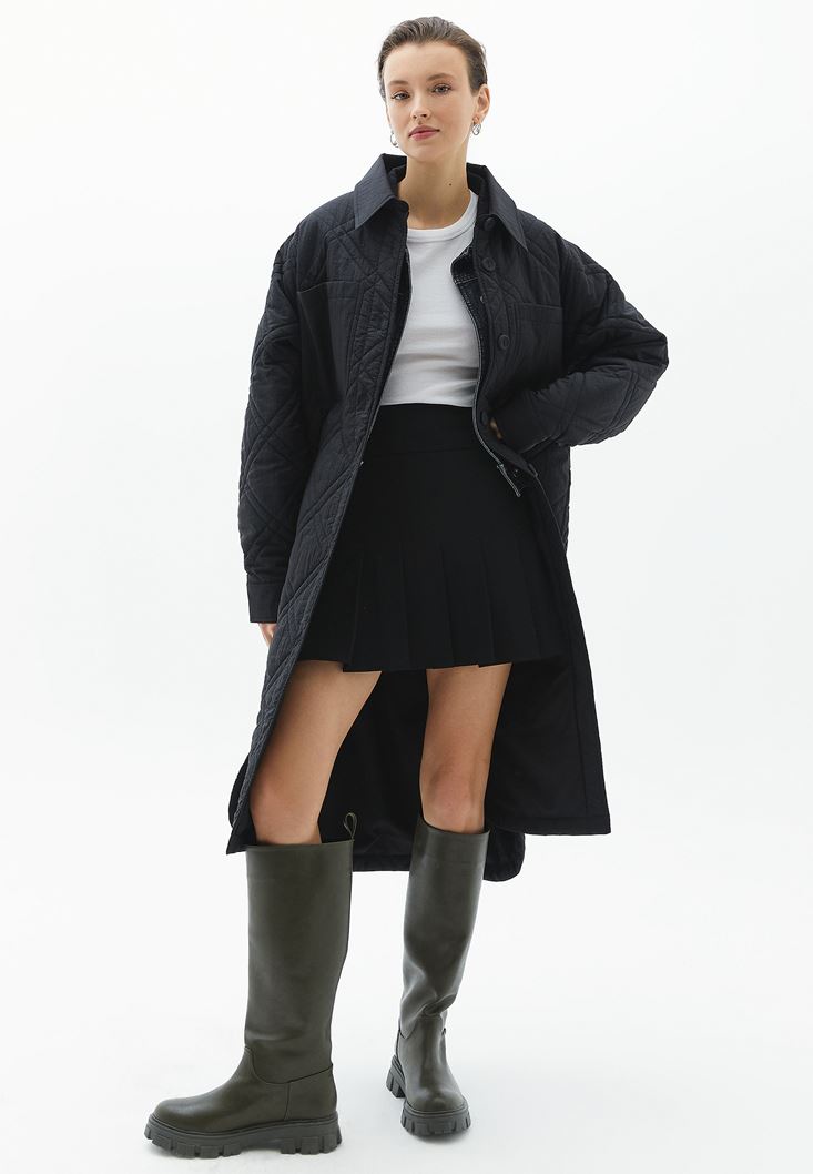 Kapitone dikişli doku, bedenden uzak oversize fit, üst ve alt kısmı ikişer cepli, düğme kapamalı, önü kısa arkası uzun asimetrik kesim, iki yanı yırtmaçlı.