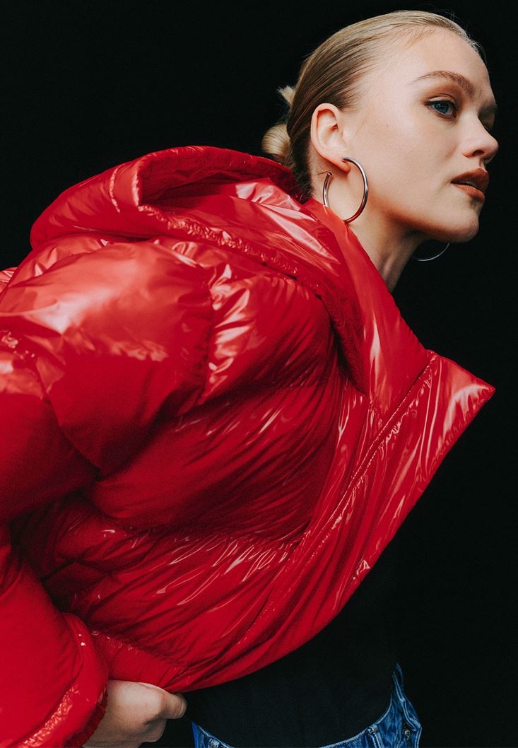 Dolgulu puf doku, kapitone dikişli, ön kısmı iki cepli, beli ayarlanabilir lastikli, bedene yakın fit, kapüşonlu, fermuar kapamalı, kol ucu lastikli, içi astarlı.