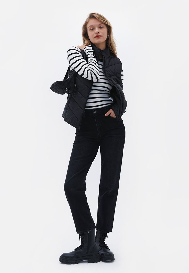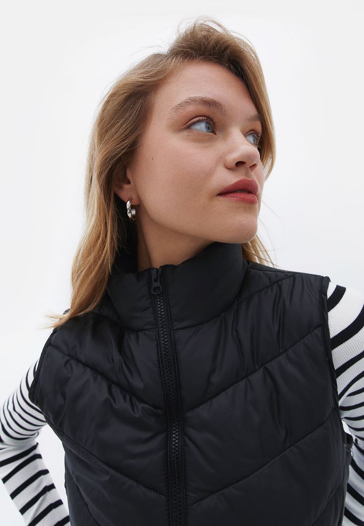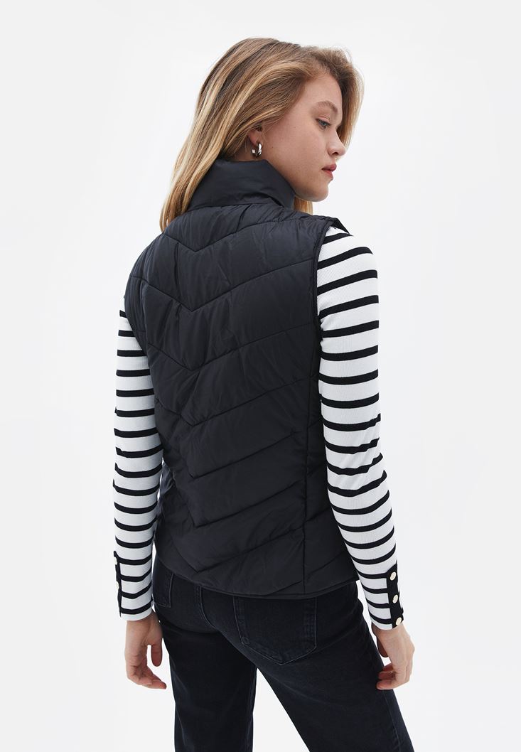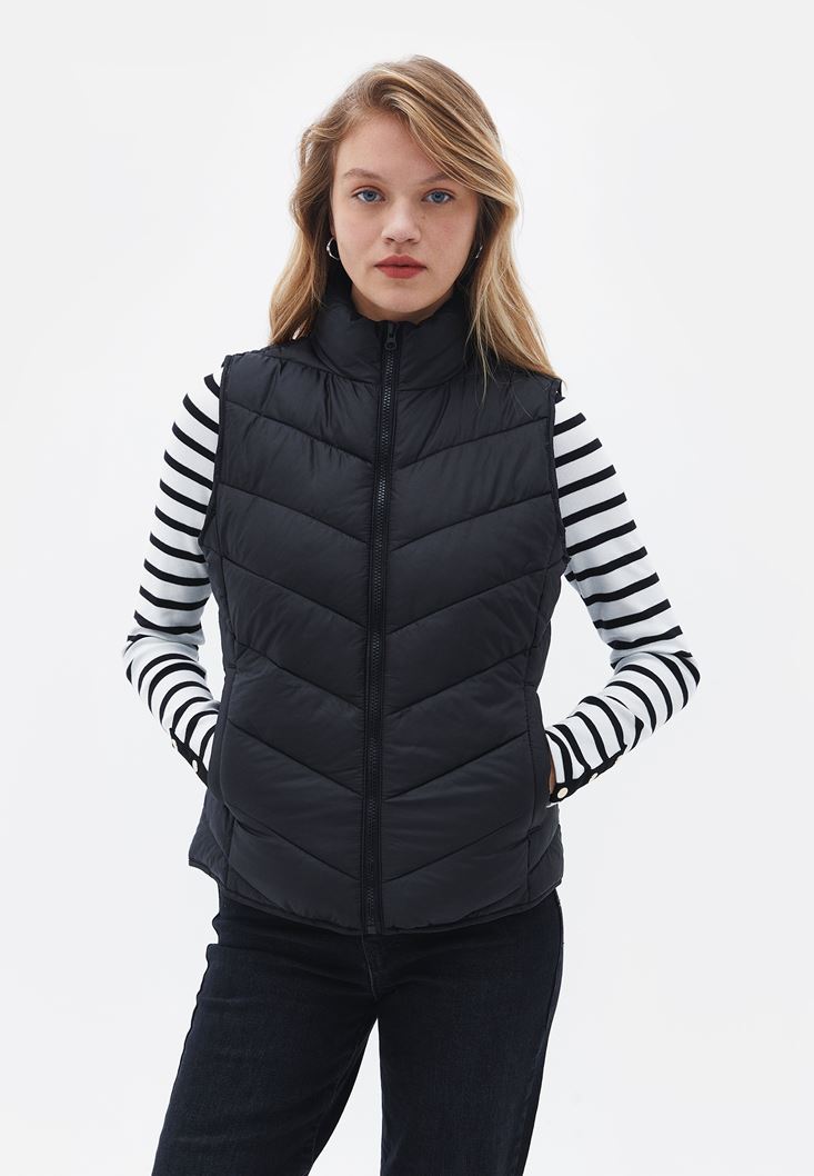 Puf dolgulu kapitone doku, yüksek yaka, fermuar kapamalı, bedene yakın rahat fit, önü iki cepli.