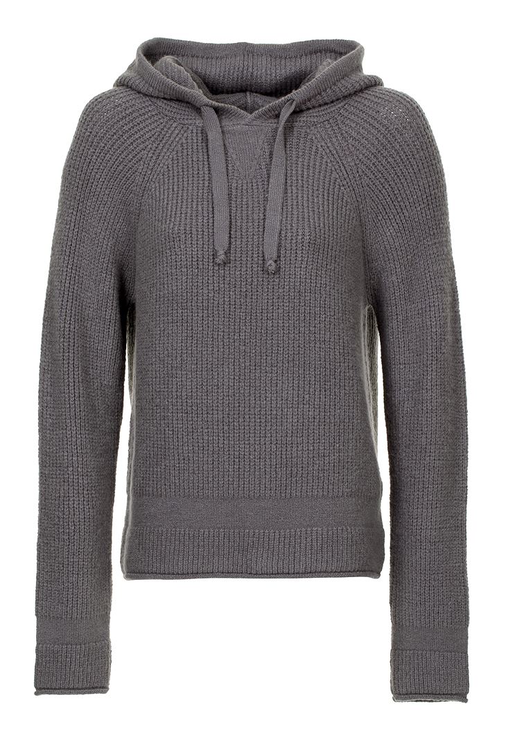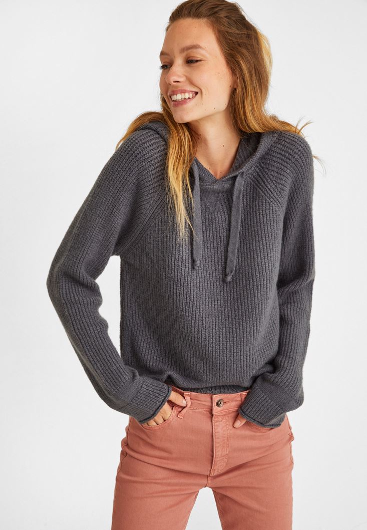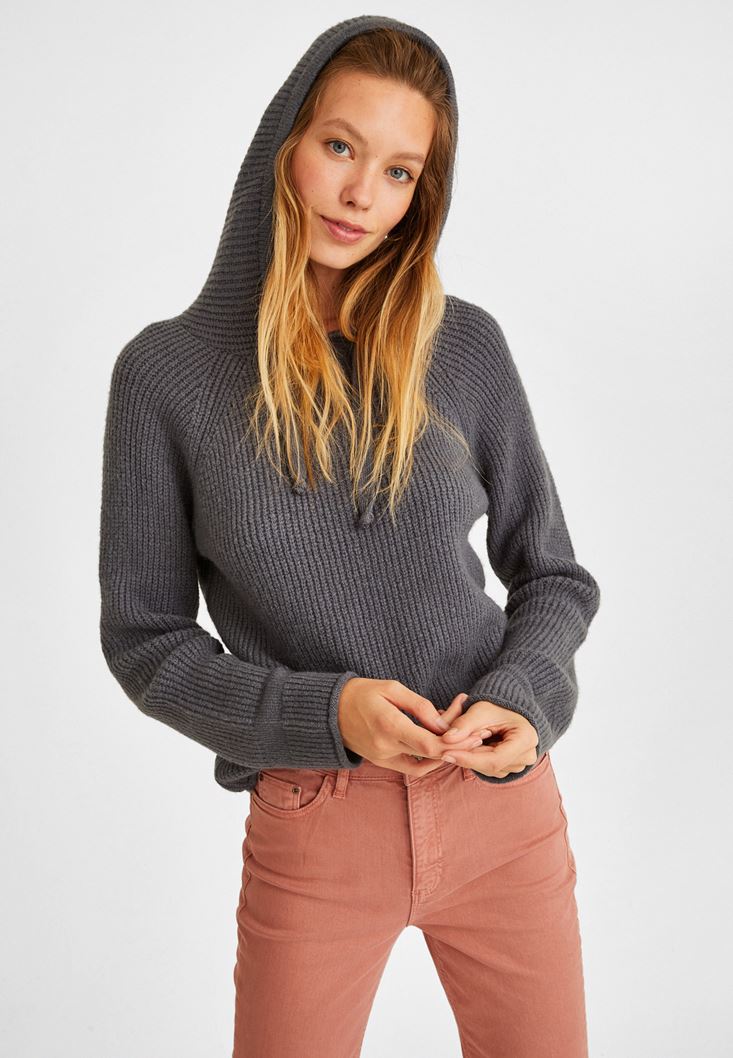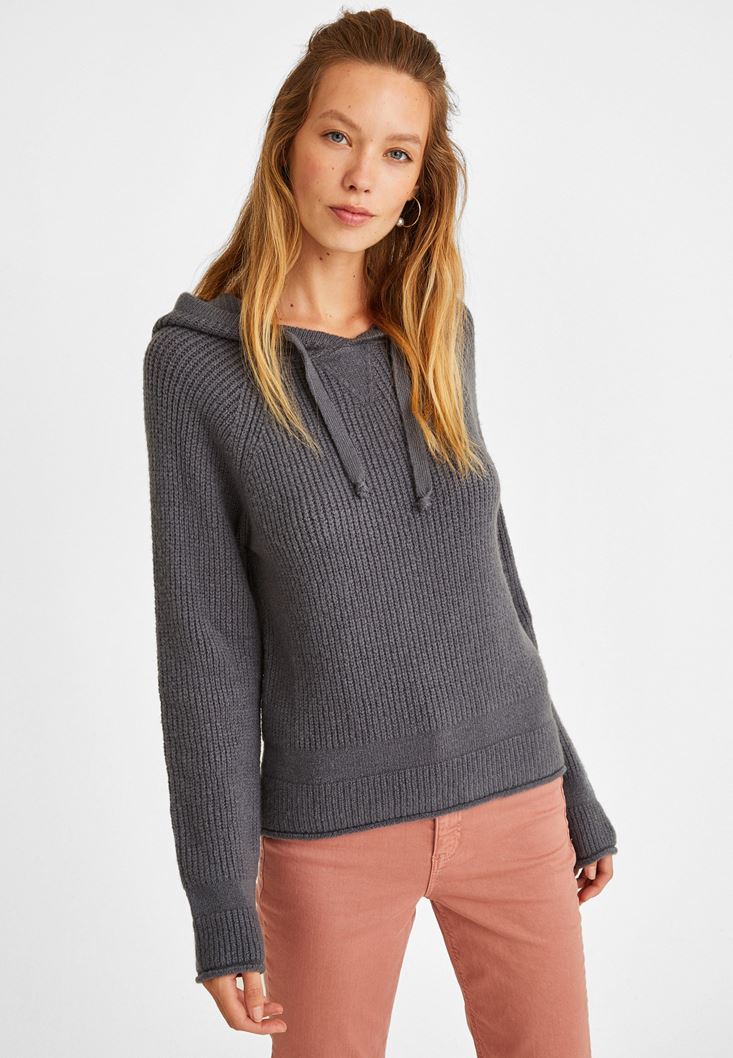 • Bayan Gri Kapüşon Detaylı Triko Kazak