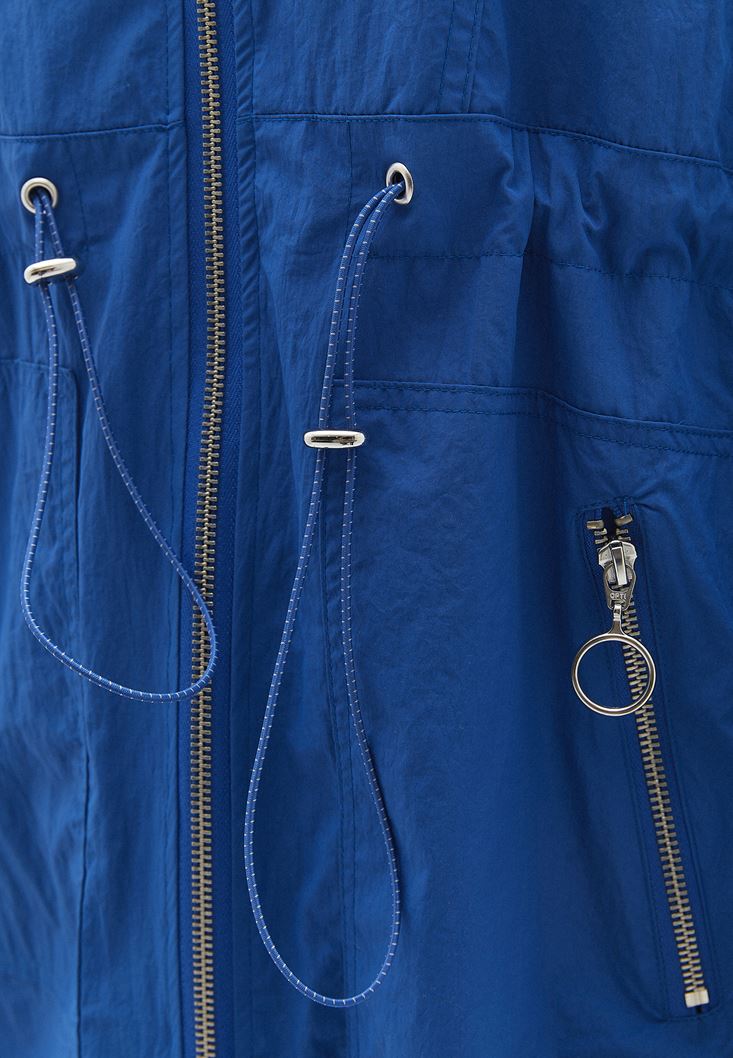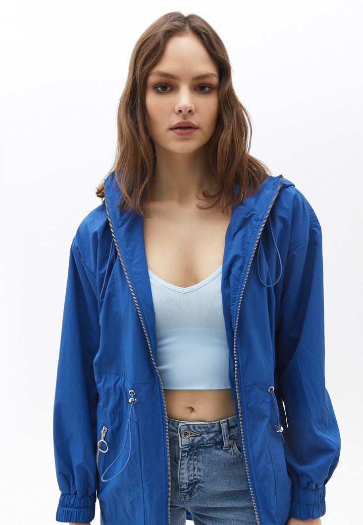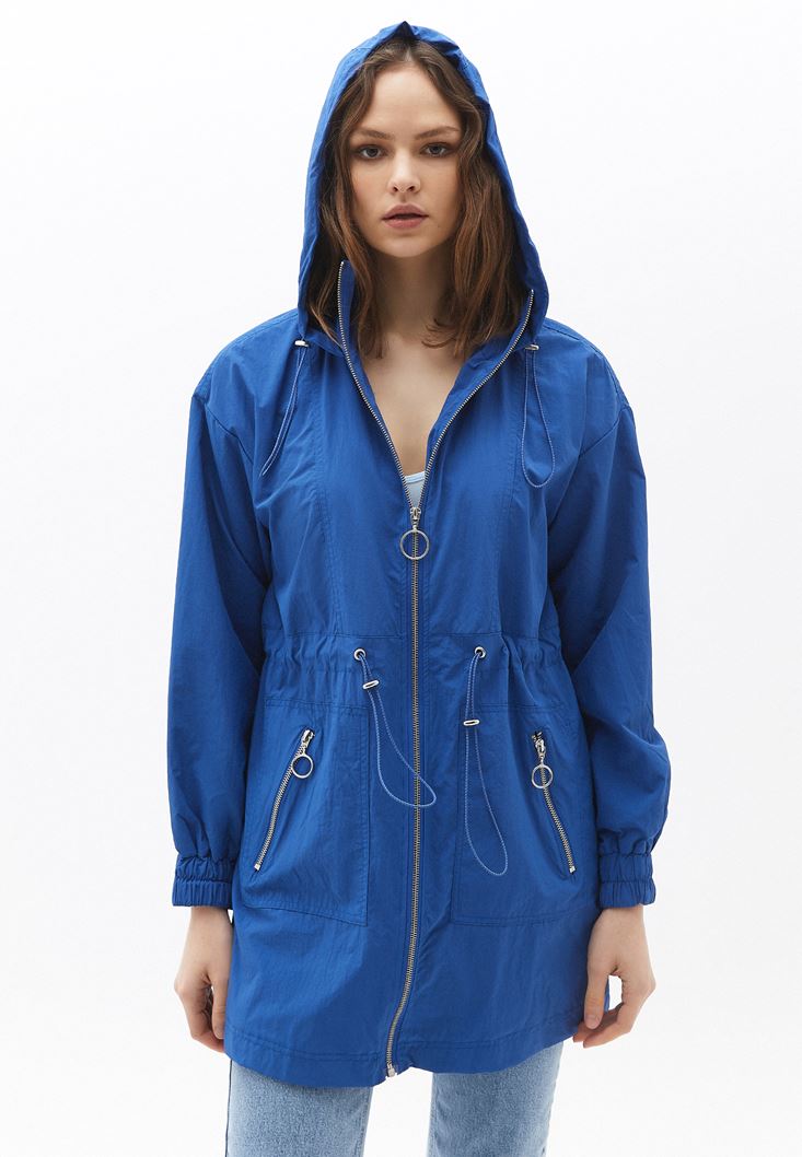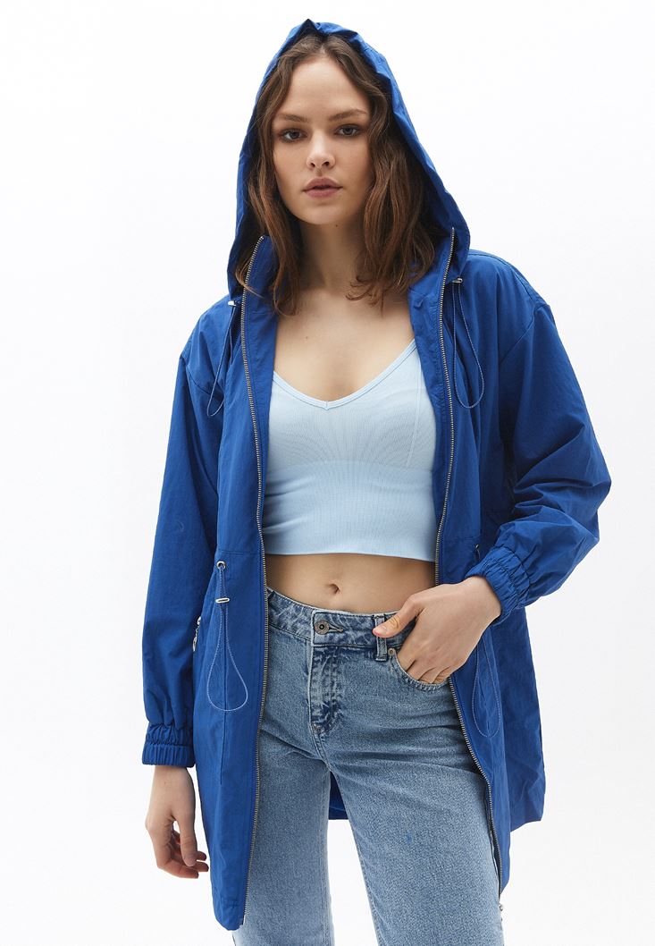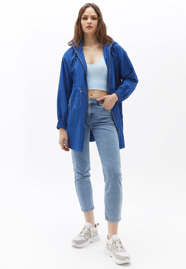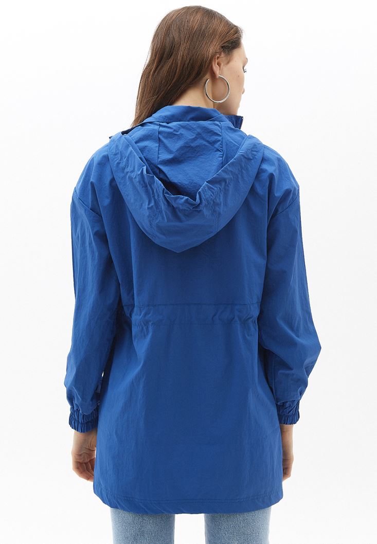 Mavi Kapüşonlu Cep Detaylı Yağmurluk