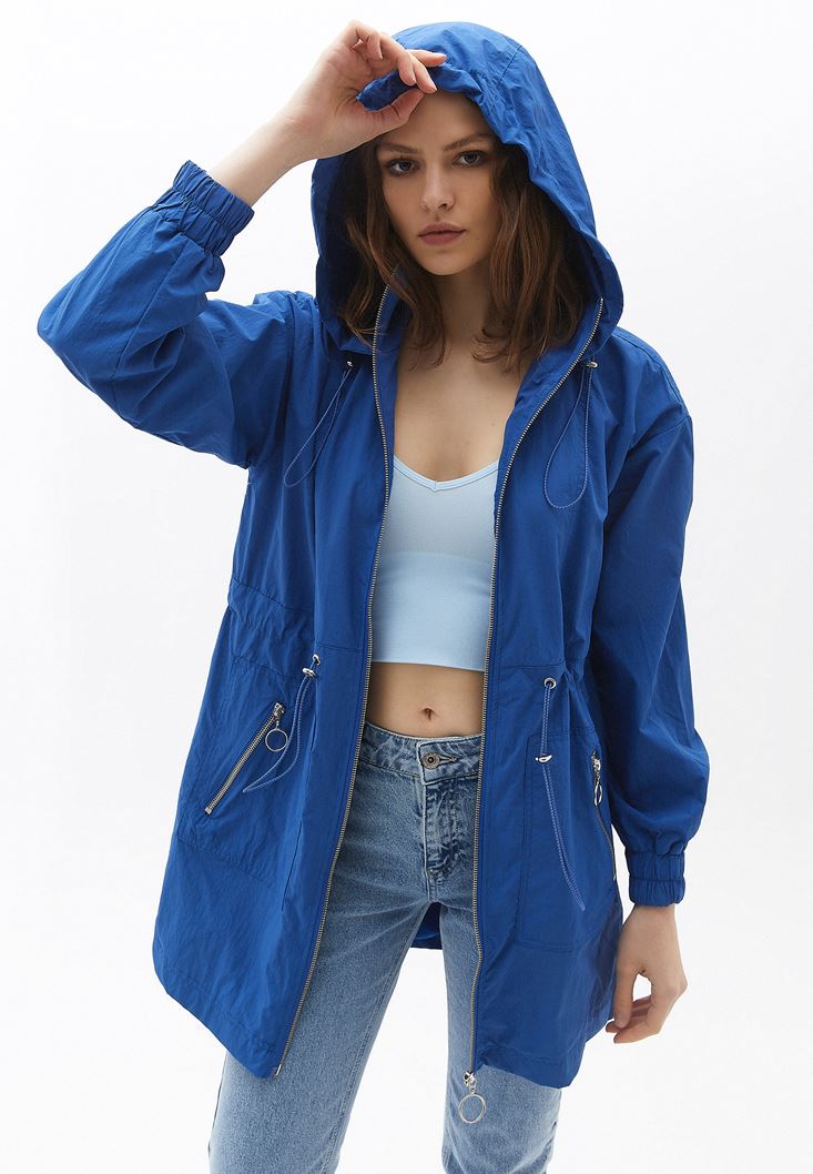 Ayarlanabilir bel ve kapüşon detayı, fermuarlı iki cep, kol ucu lastikli, midi boy, fermuar kapamalı, içi astarlı.