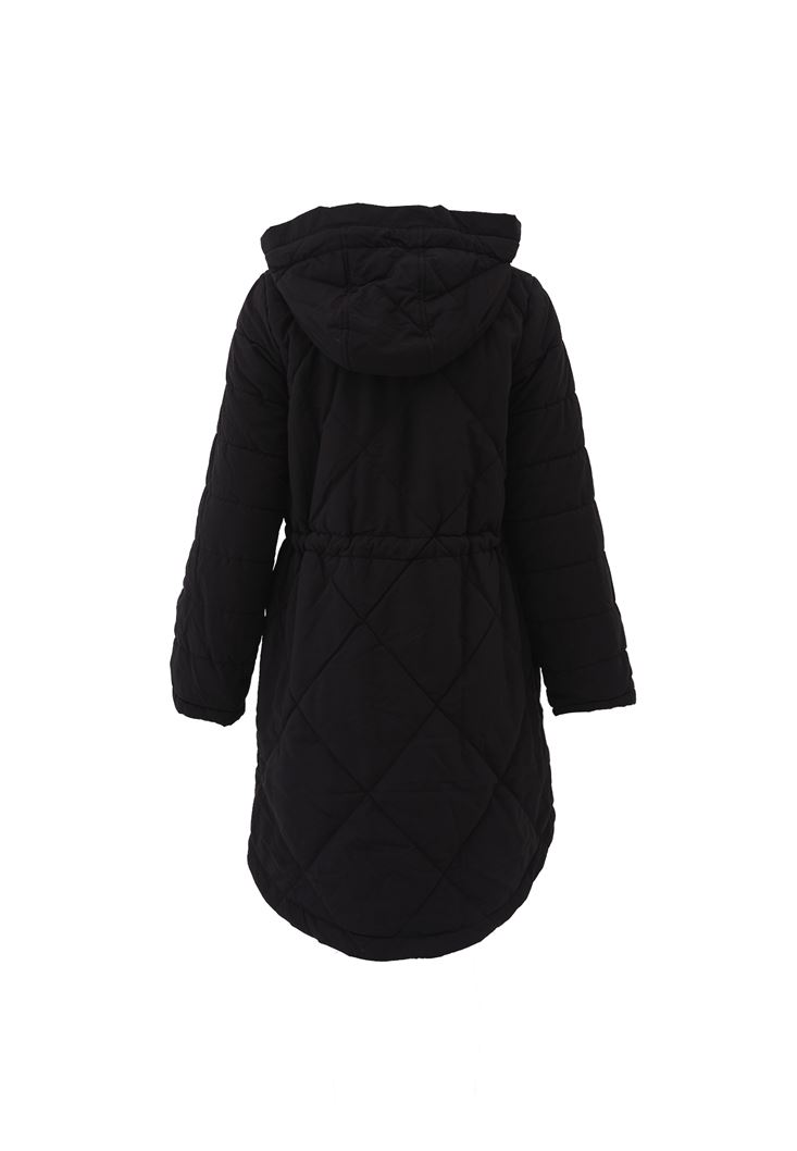Yumuşak puf doku, kapitone tasarım, bedenden uzak rahat kalıp, beli ayarlanabilir bağcıklı, iki cepli, ayarlanabilir kapüşonlu, önü kısa arkası uzun asimetrik kesim, çıtçıt ve fermuar kapamalı, içi astarlı.
