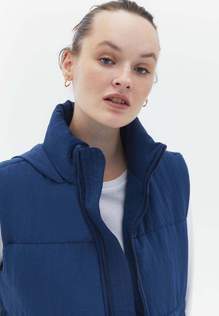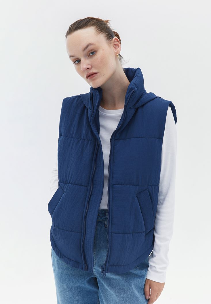 İçi puf dolgulu kapitone doku, bedene yakın fit, çıkarılabilir kapüşonlu, yüksek yaka, fermuar kapamalı, iki cepli.