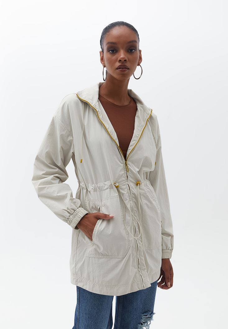 • Bayan Bej Kapüşonlu Midi Yağmurluk