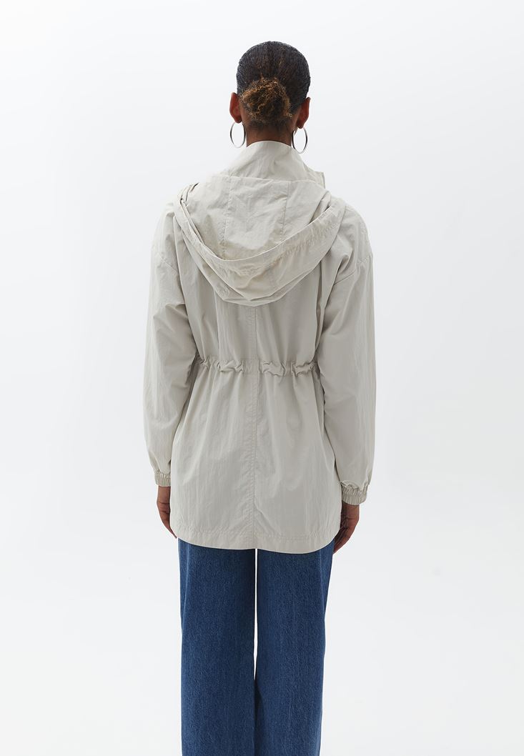 Bedenden uzak rahat fit, ayarlanabilir kapüşonlu, uzun kollu, ön kısmı iki cepli, midi boy, beli ayarlanabilir lastikli, fermuar kapamalı, yüksek yaka.