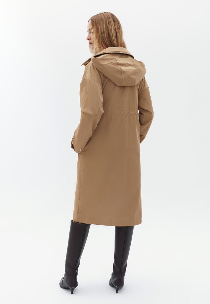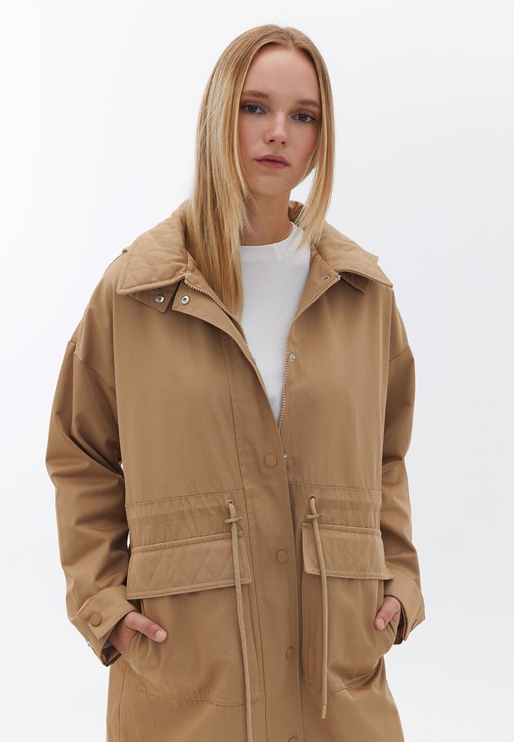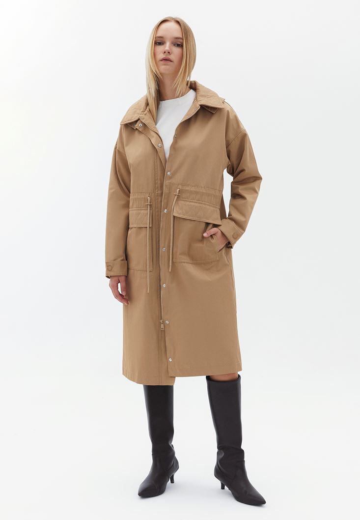 Bedenden uzak loose fit, su geçirmez özel tasarım, kapüşonlu, beli ayarlanabilir bağcıklı, çıtçıt ve fermuar kapamalı, kapaklı cep tasarımı aynı zamanda yan bölümleri de cep tasarımlı, içi astarlı, uzun boy kesim.