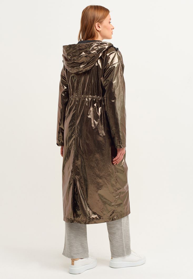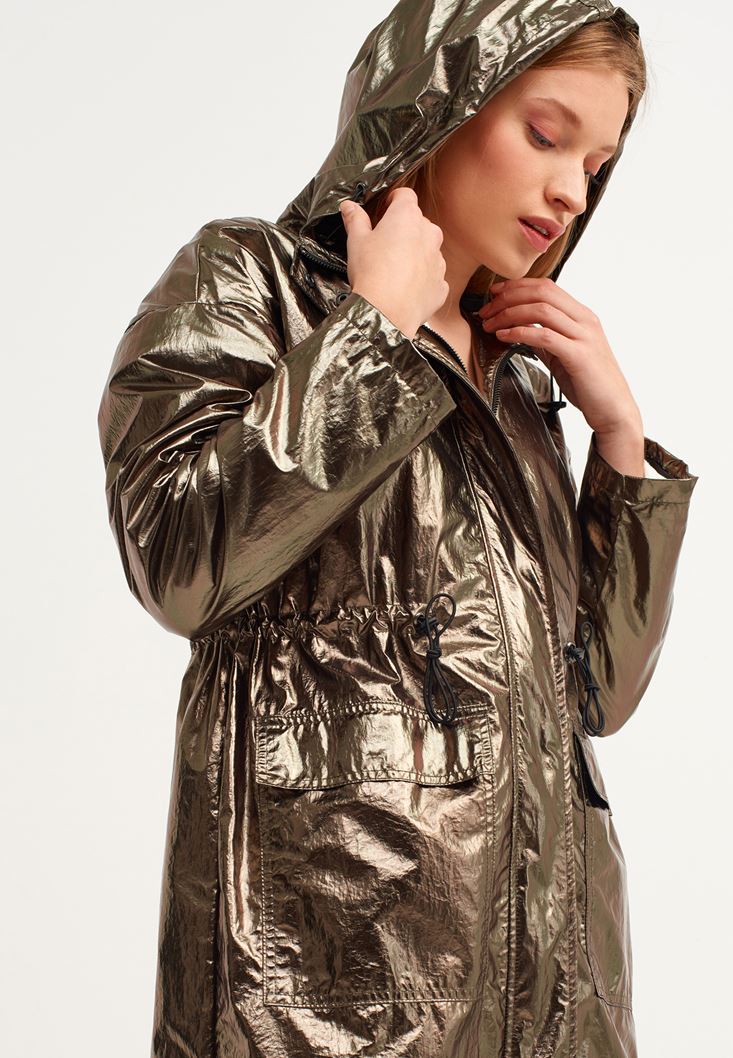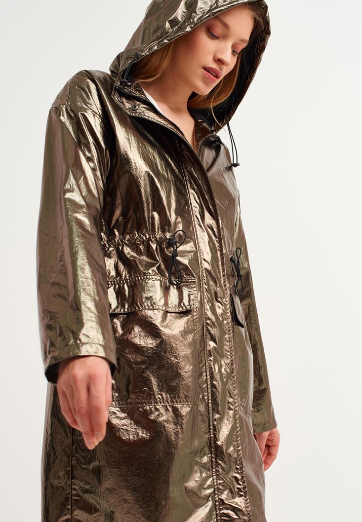 Metalik görünümlü özel doku, ayarlanabilir büzgülü bel yapısı, kapaklı iki cep, fermuar ve çıtçıt kapamalı, ayarlanabilen bağcıklı kapüşon.