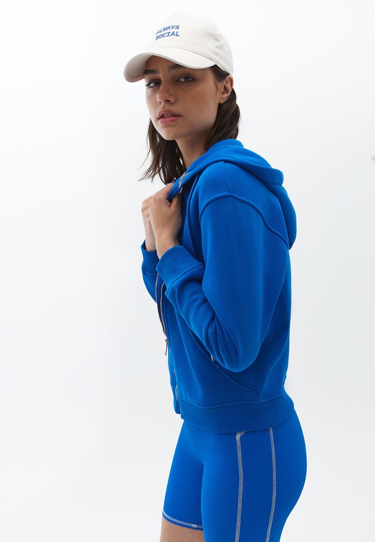 Pamuk karışımlı doku, bedene yakın fit, bağcık detaylı kapüşon, iki cepli, fermuar kapamalı, kapüşon içi renkli dikiş detaylı.