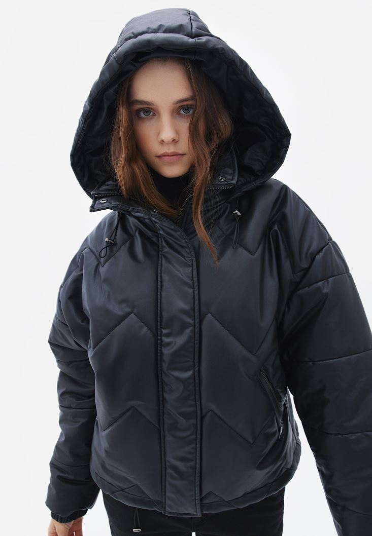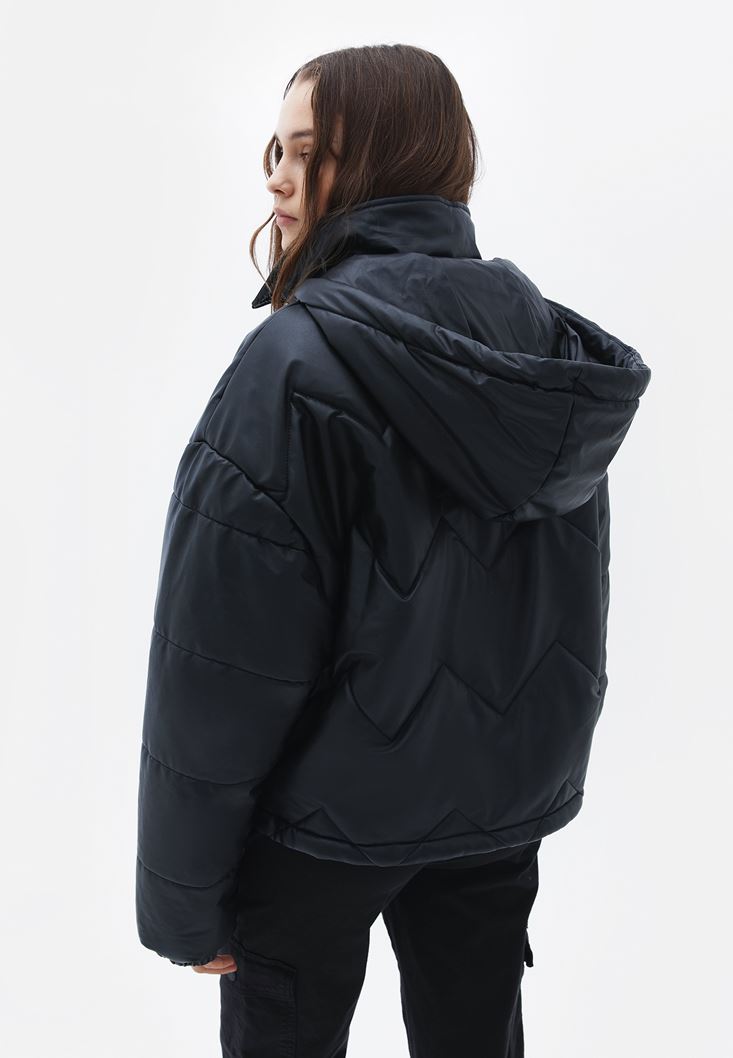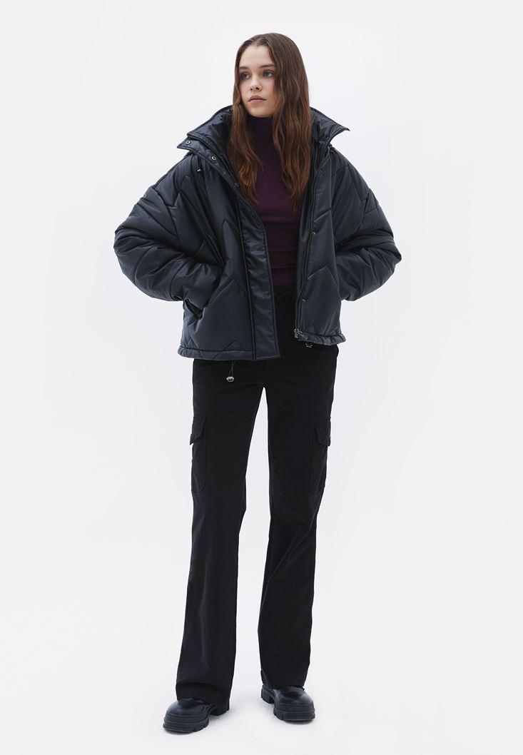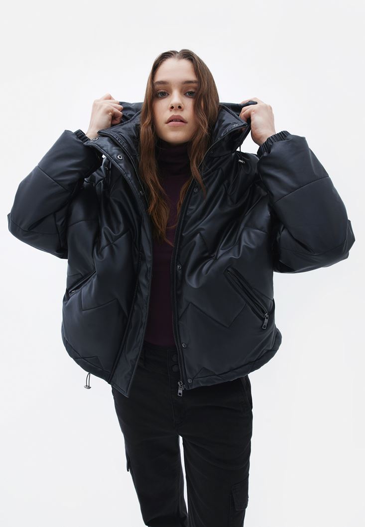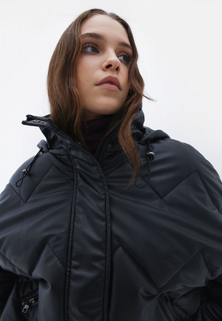 İçi dolgulu vegan deri doku, beli ve kapüşonu ayarlanabilir lastikli, fermuar ve çıtçıt kapamalı, fermuarlı iki cep, kapitone dikişli, bedene uzak rahat fit, kol ucu lastikli.