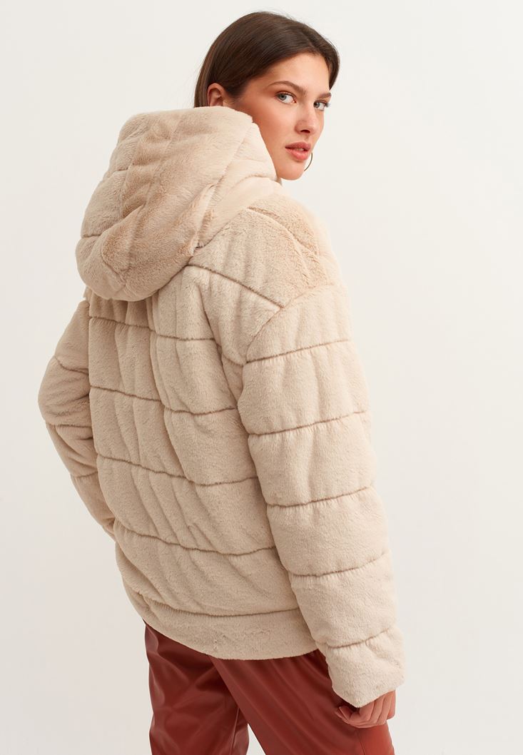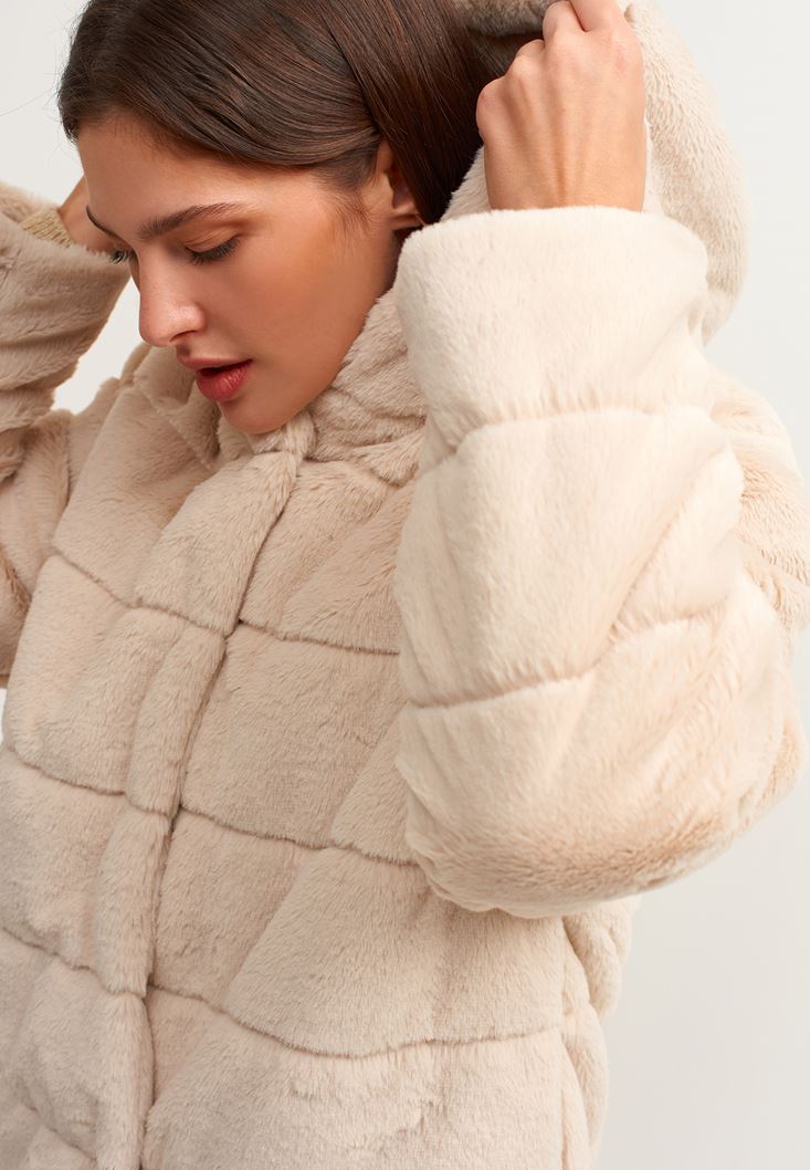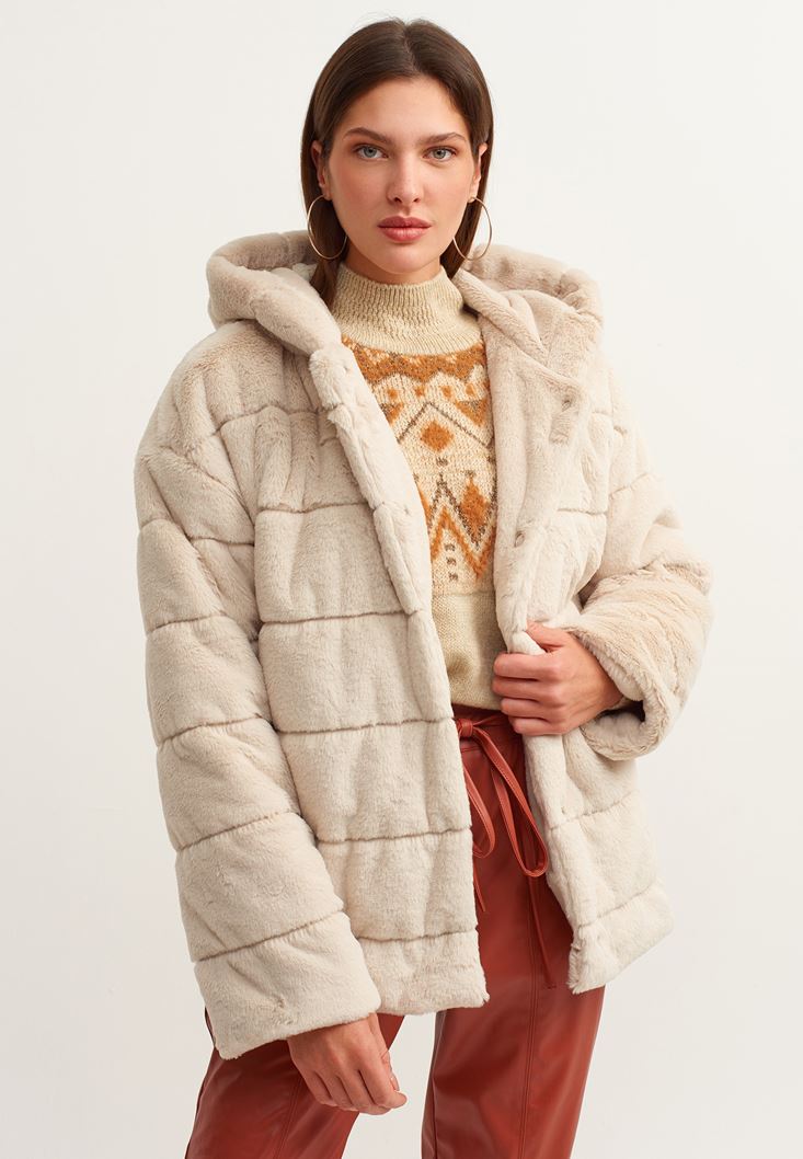 Krem Kapüşonlu Vegan Kürk Ceket