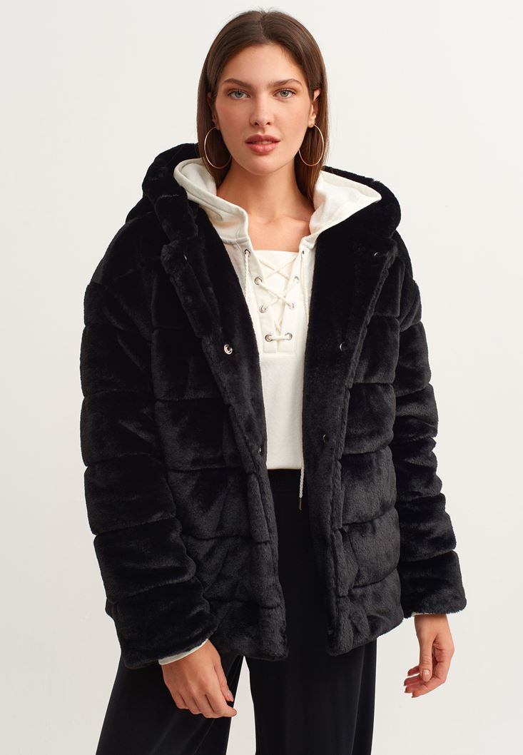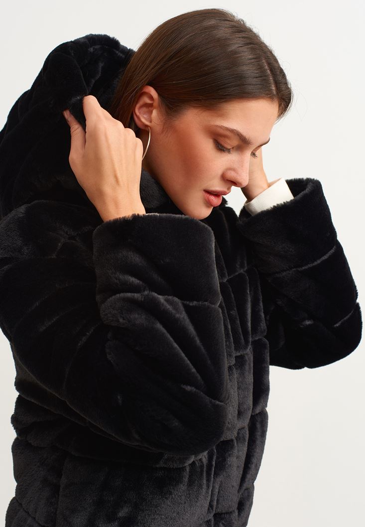 • Bayan Siyah Kapüşonlu Vegan Kürk Ceket