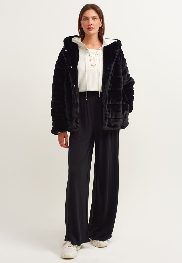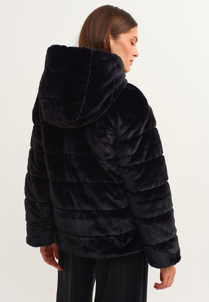 Siyah Kapüşonlu Vegan Kürk Ceket