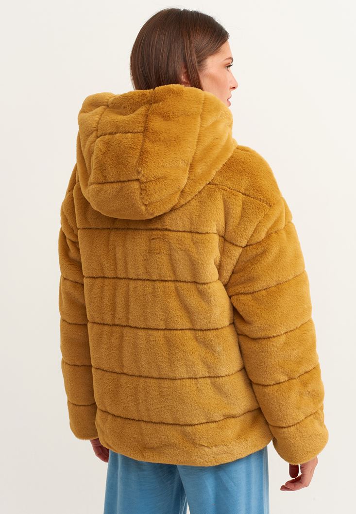 Turuncu Kapüşonlu Vegan Kürk Ceket