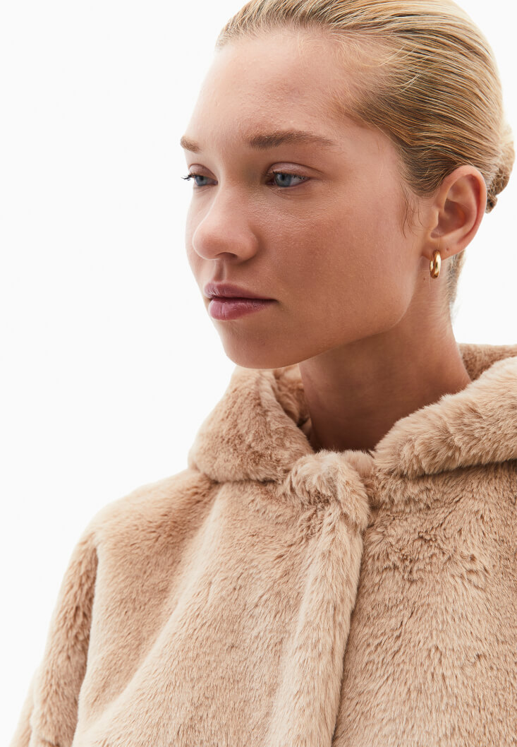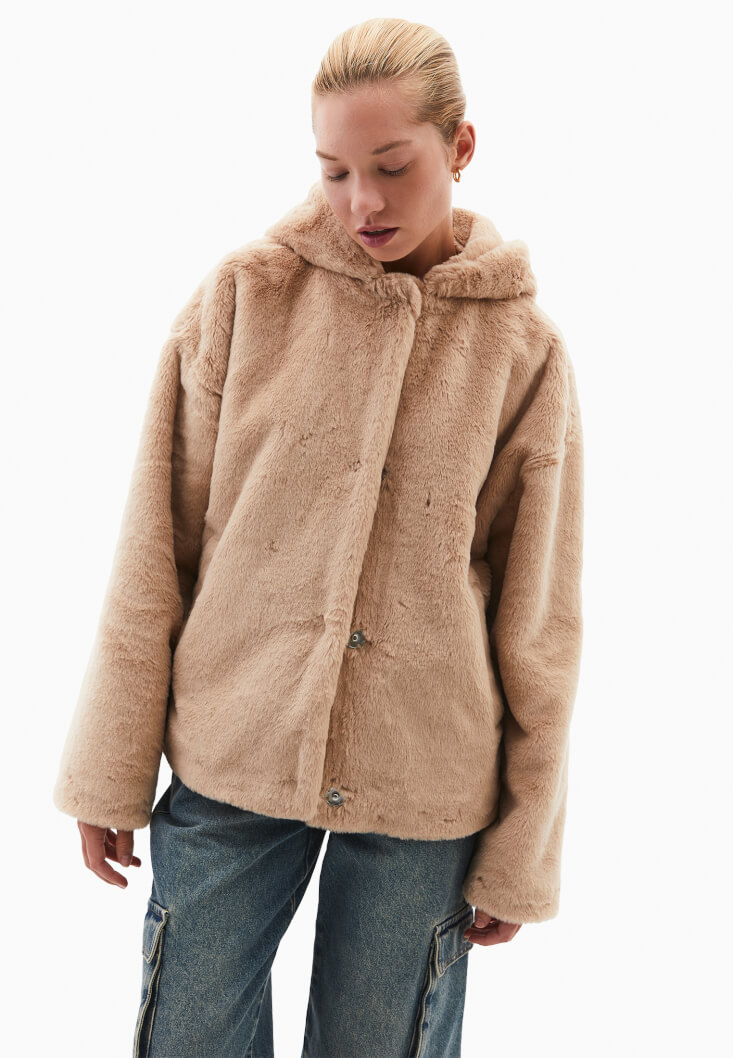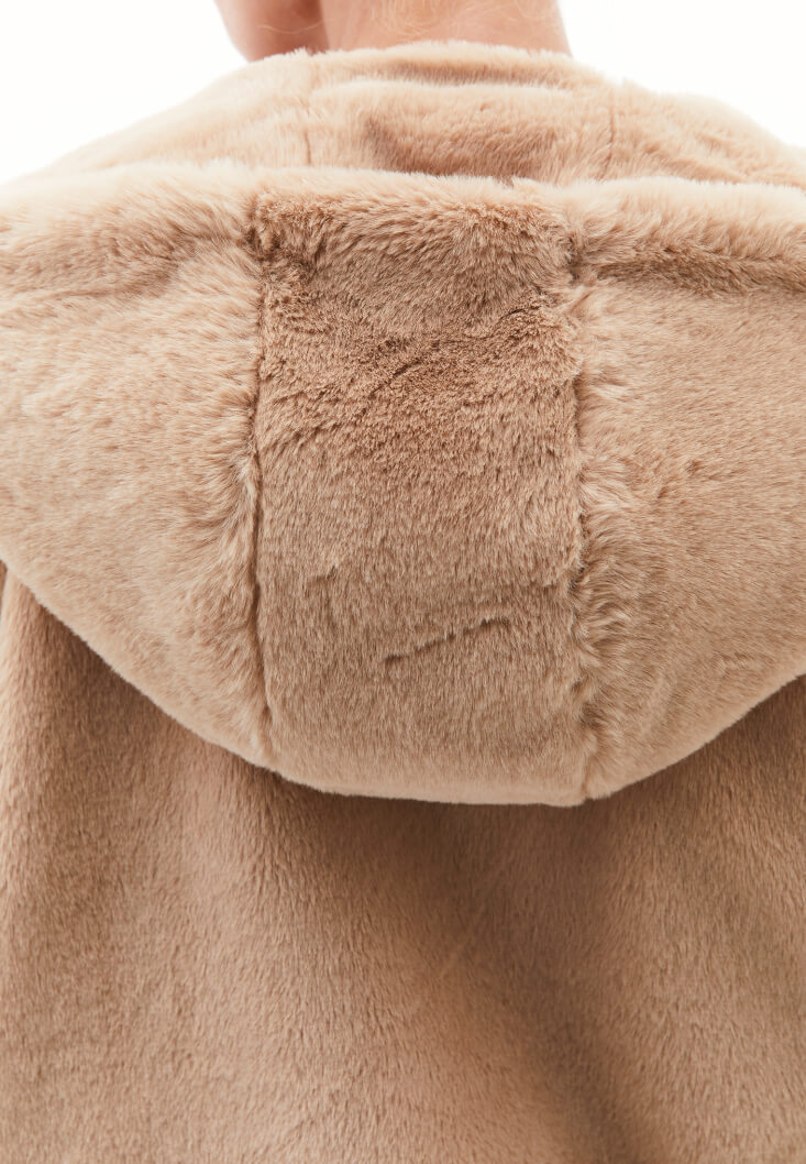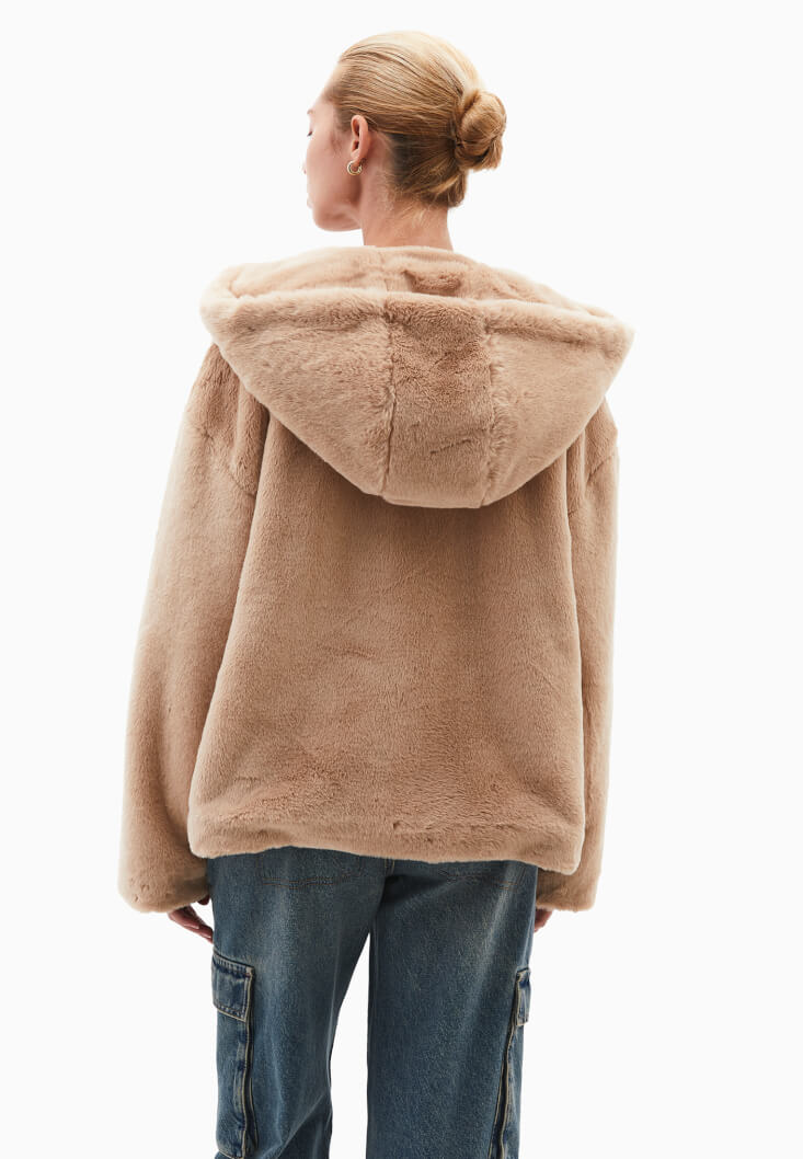 • Bayan Kahverengi Kapüşonlu Vegan Kürk Ceket