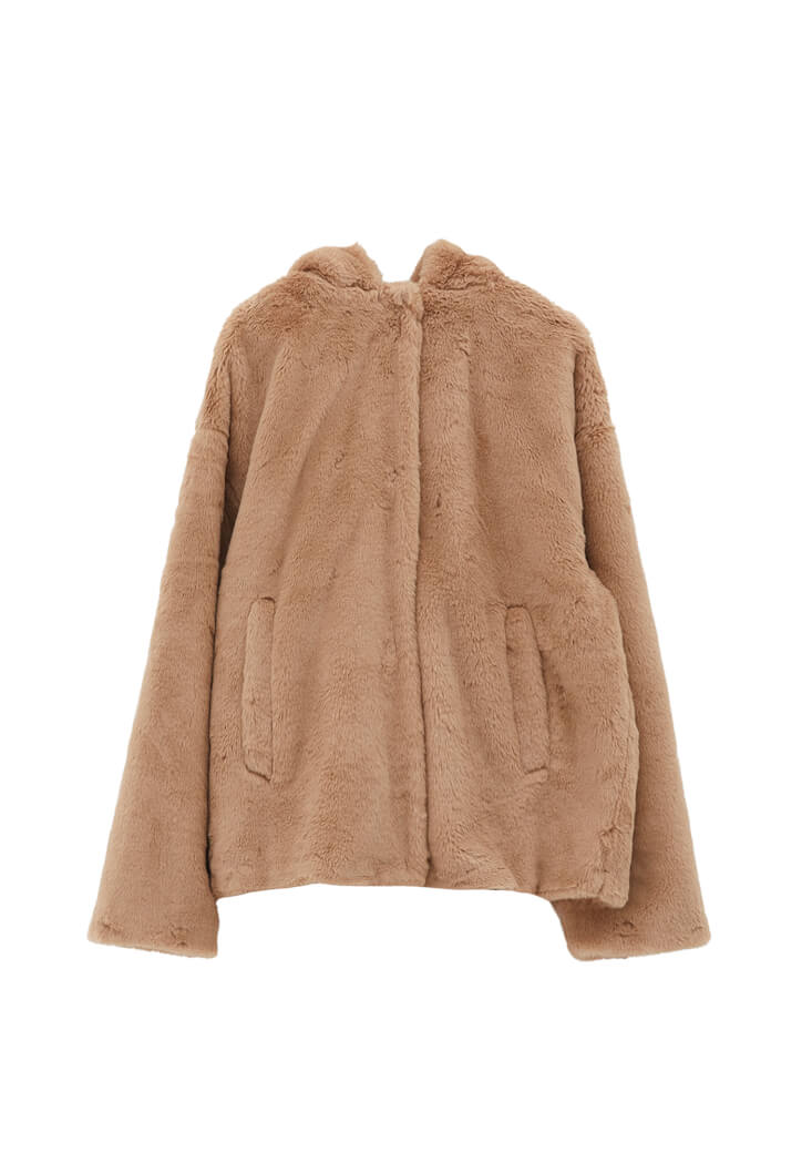 Kahverengi Kapüşonlu Vegan Kürk Ceket