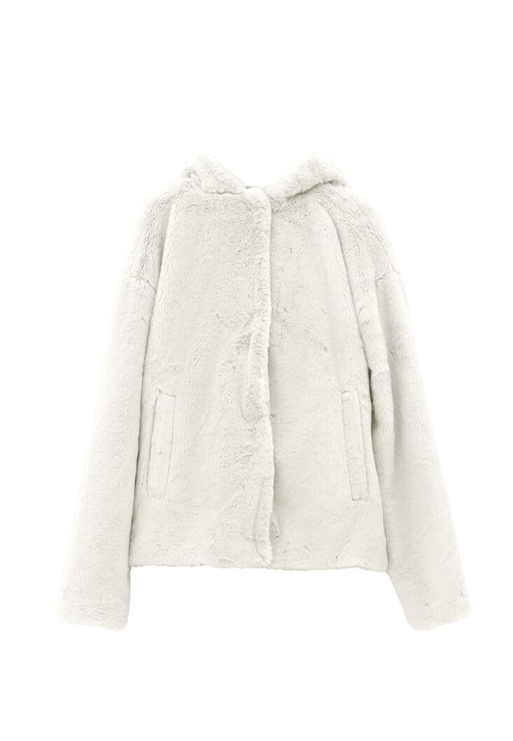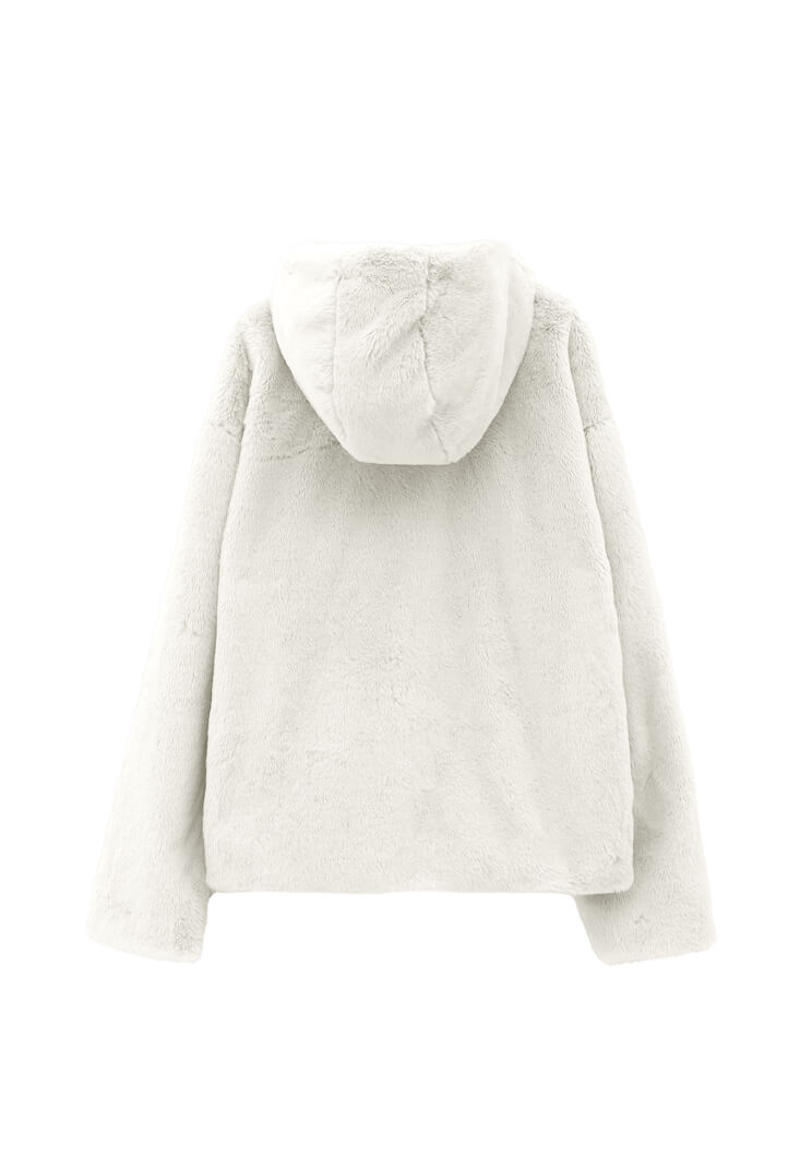 Krem Kapüşonlu Vegan Kürk Ceket