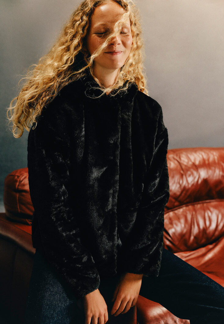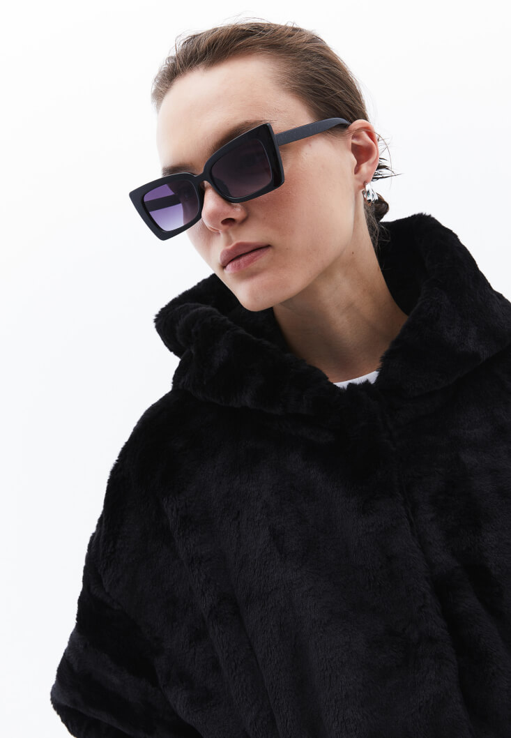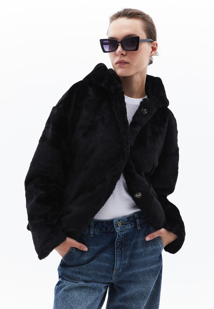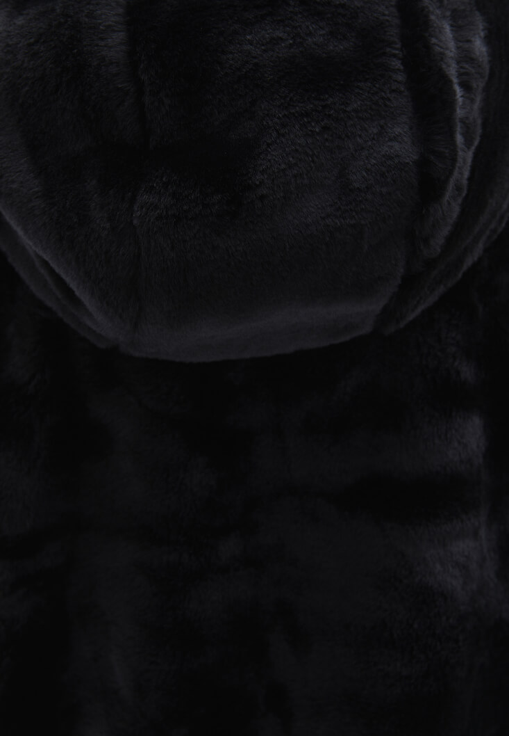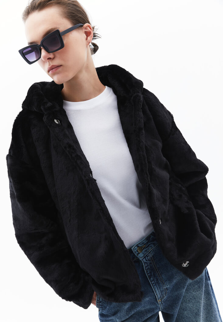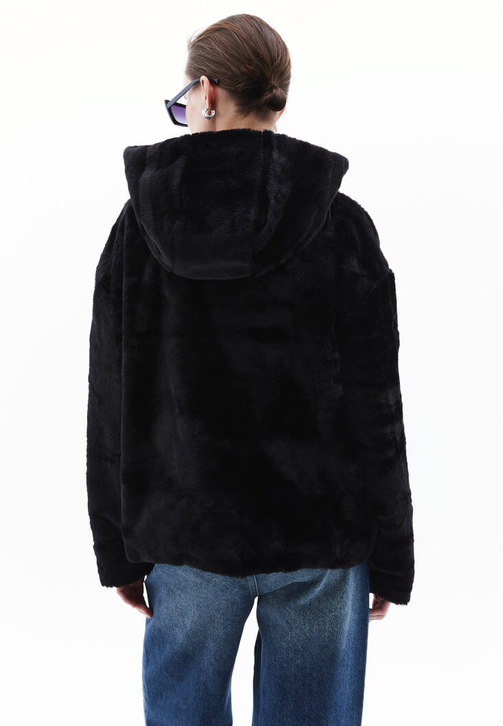 • Bayan Siyah Kapüşonlu Vegan Kürk Ceket
