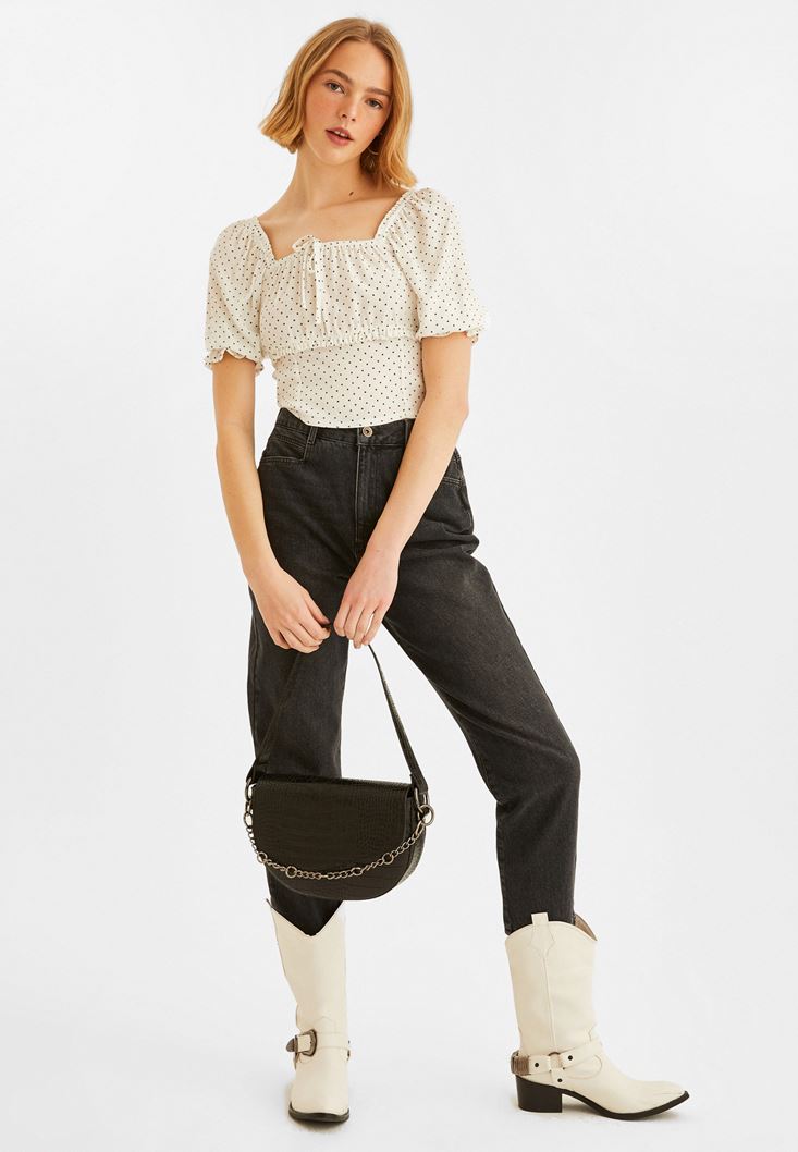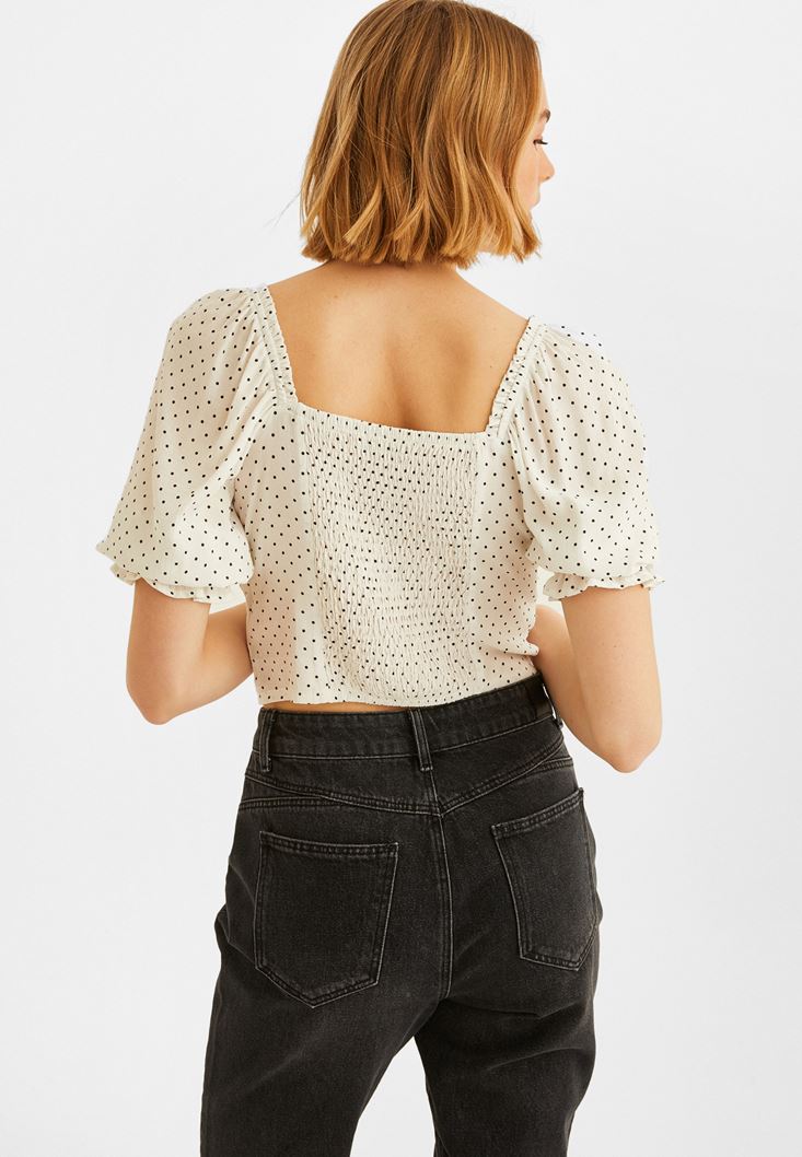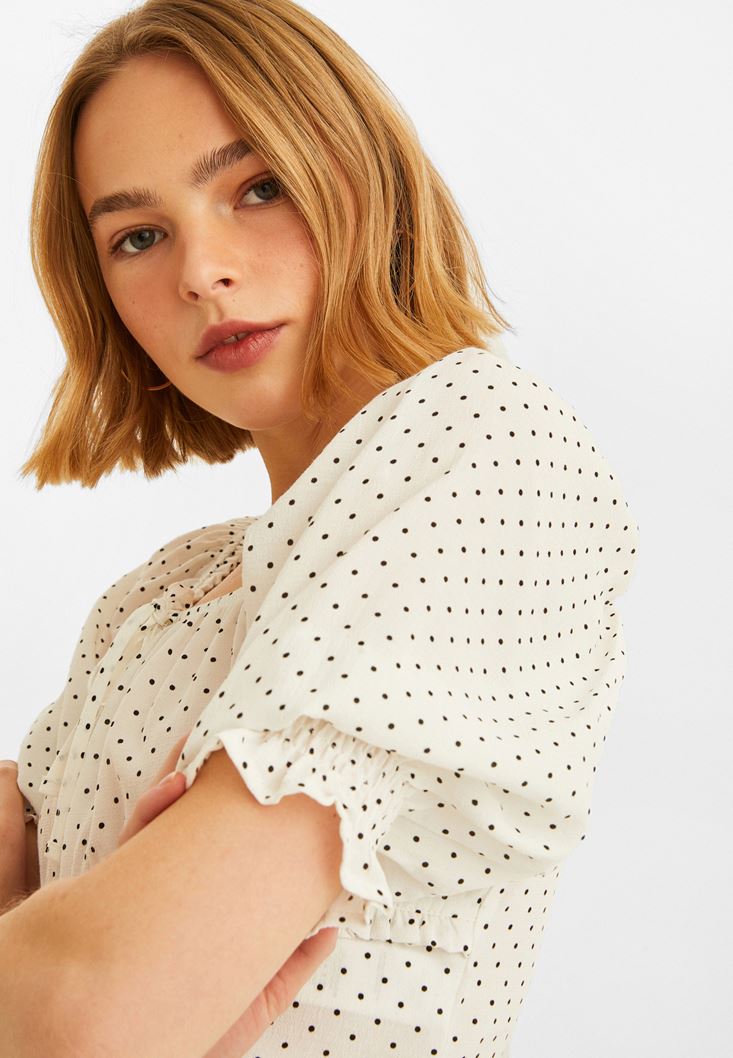Beyaz Puantiye Kare Yaka Bluz