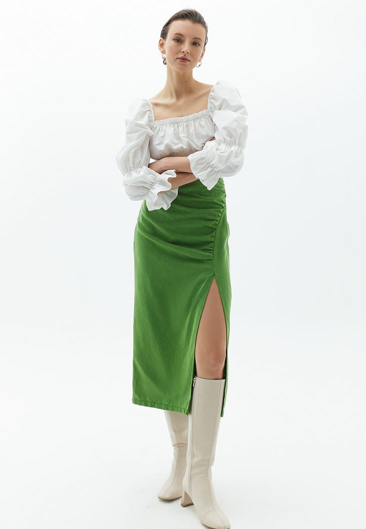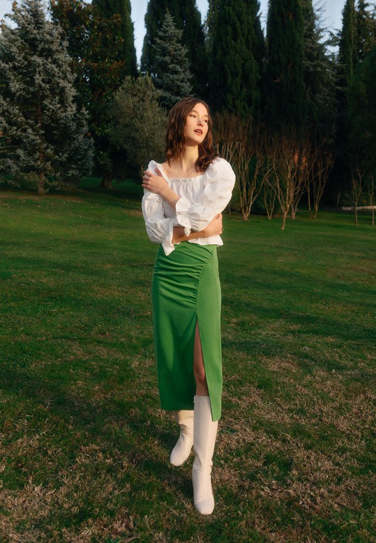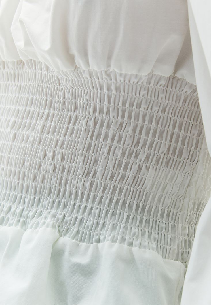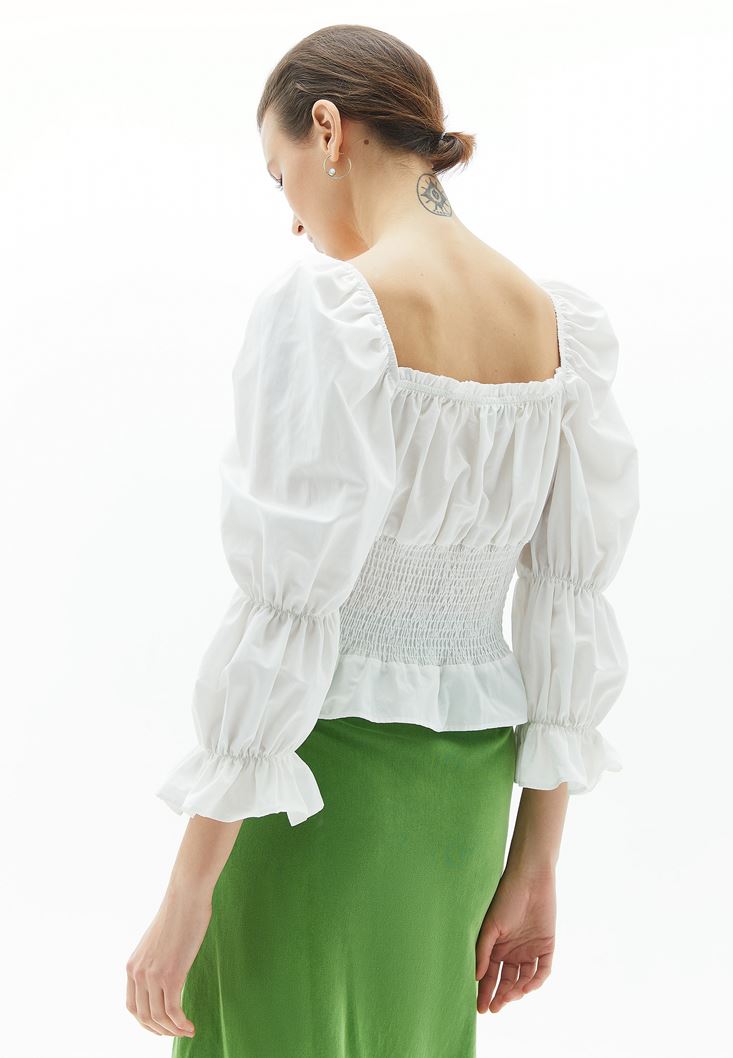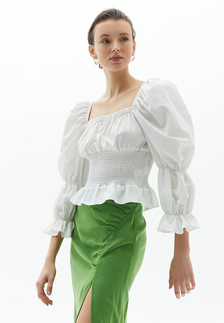 Pamuk karışımlı özel doku, kare yaka, balon kollu, crop kesim, bel kısmı gipeli, kolu ve yakası lastik detaylı.