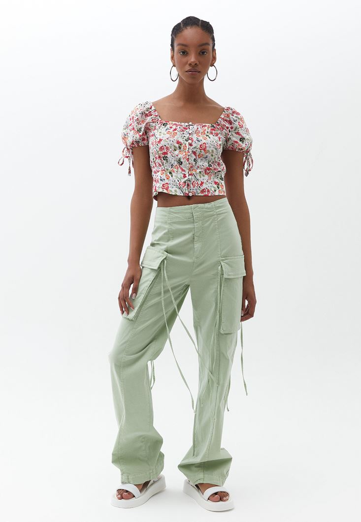 Kare Yaka Düğmeli Bluz ve Pantolon Kombini