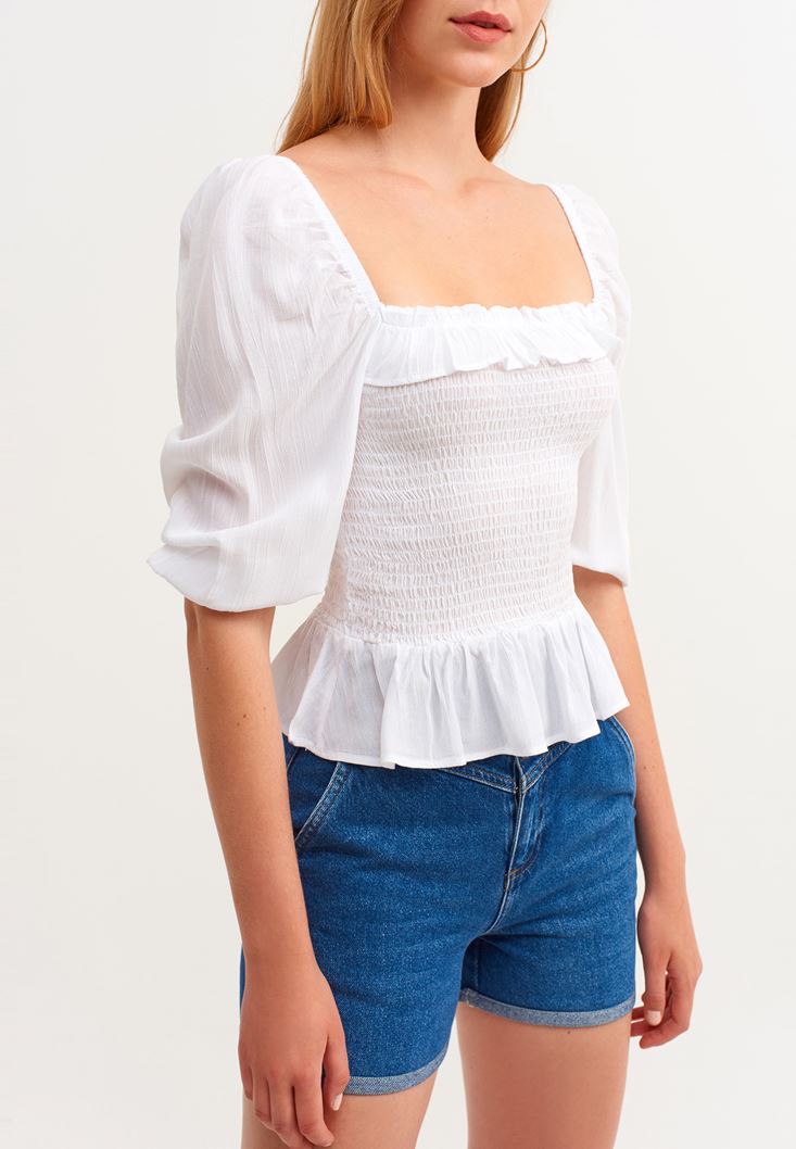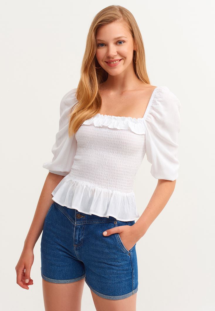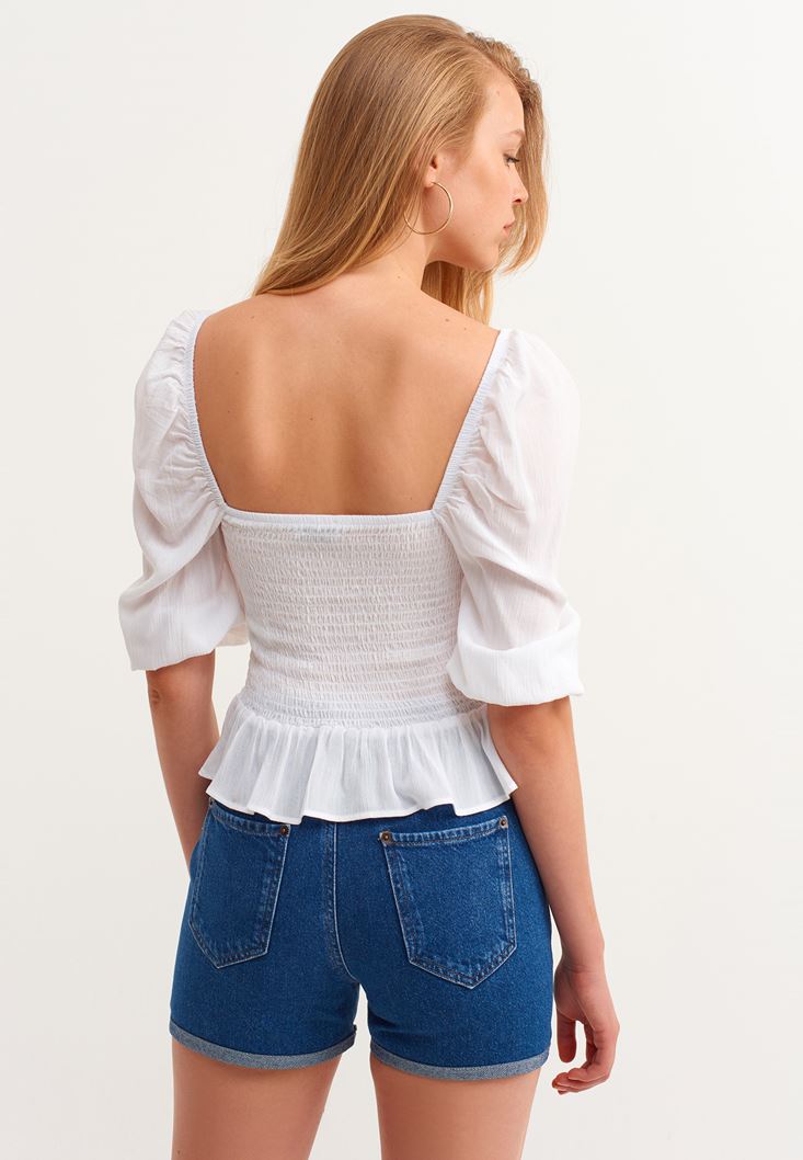 • Bayan Beyaz Kare Yaka Romantik Bluz