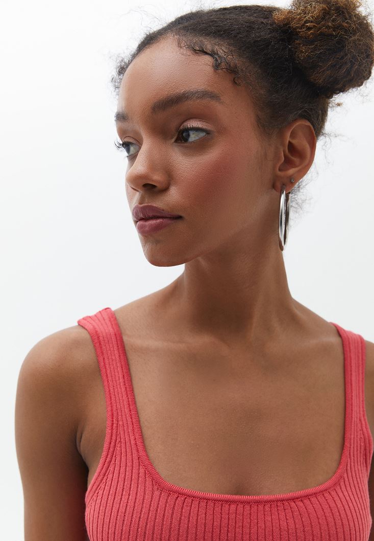 Viskon karışımlı fitilli doku, kare yaka, kalın askılı, bedeni saran esnek fit, standart boy.