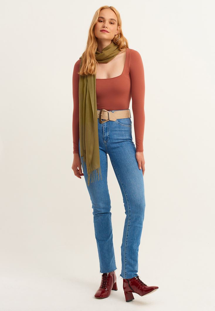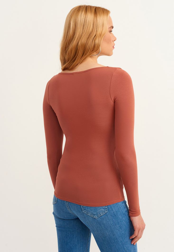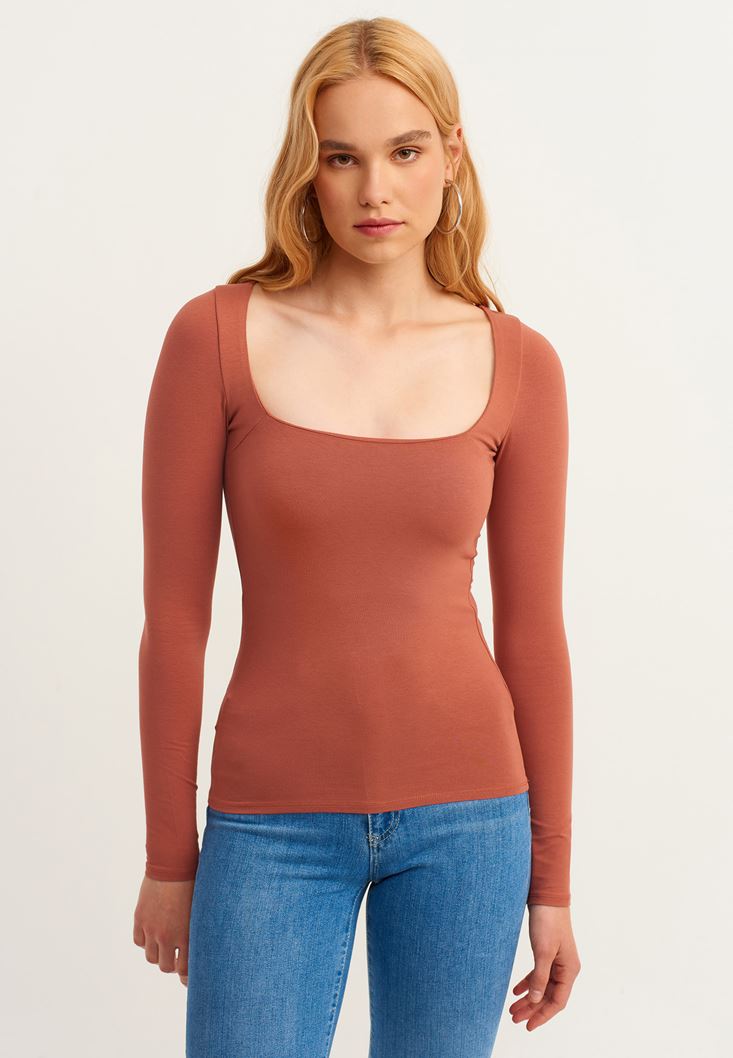 • Bayan Turuncu Kare Yaka Uzun Kollu Tişört