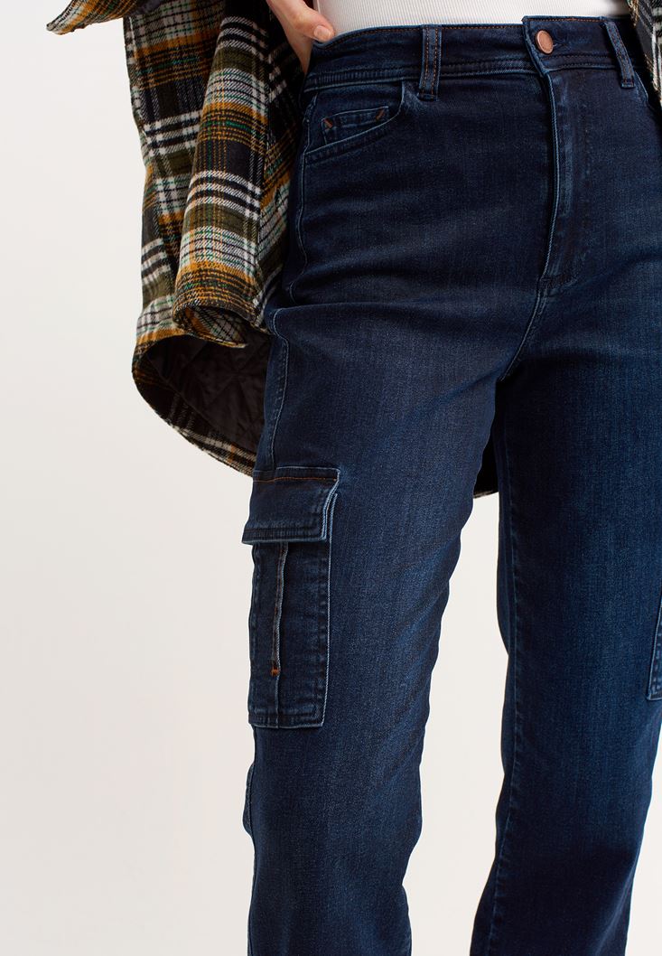 Lastikli jogger paça formu, kargo formlu cepler, pamuklu denim doku.