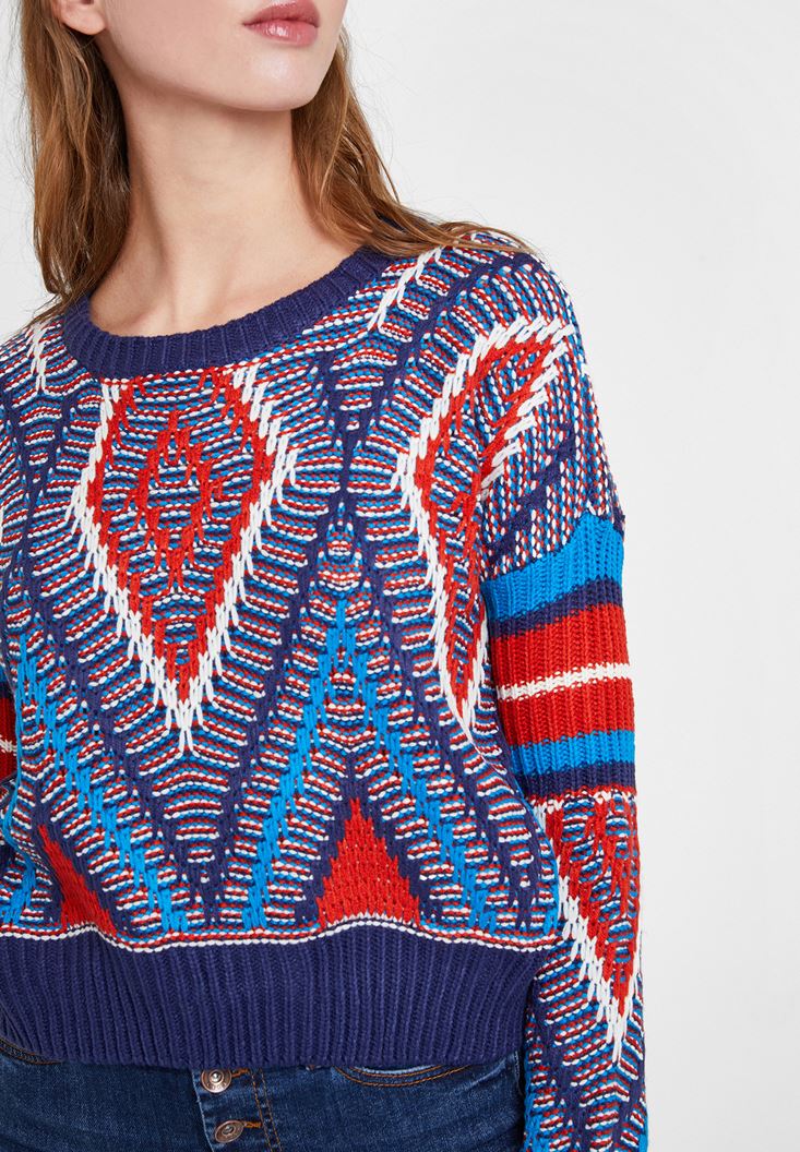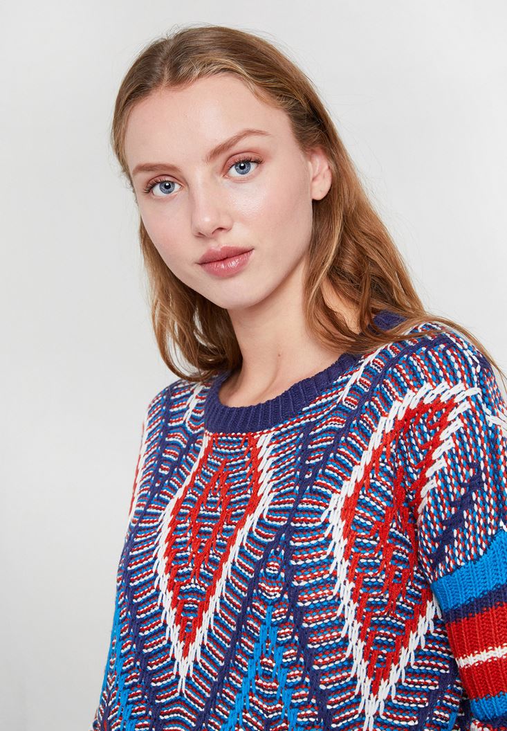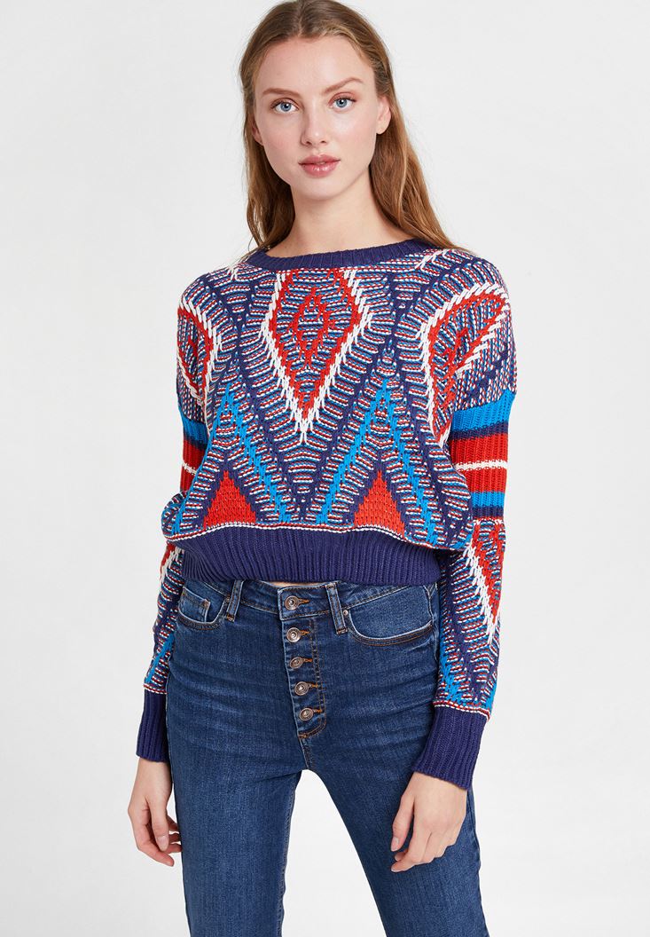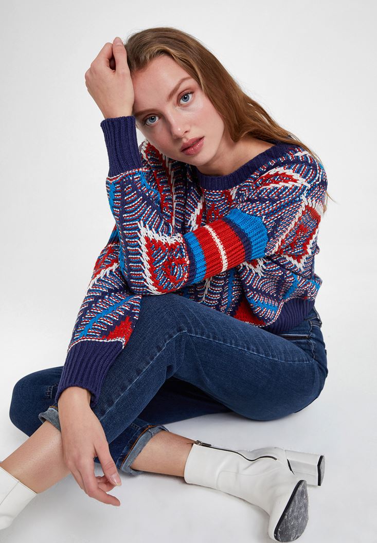 Karışık Desen Detaylı Triko salaş duruşu, modern kesimi ve dikkat çekici desenleri ile kombinlerinizde farklı bir görünüm elde etmenize yardımcı olacak triko modelleri arasında yer alıyor. Geniş bisiklet yaka kesimi, yakayı ön plana çıkaran koyu renkli lastik formundaki örgü detay tasarımın duruşunu güçlendiriyor. Triko modelinin bel ve bilek kesiminde kullanılan lastik formundaki örgü detaylar da yaka tasarımı ile hoş bir uyum sağlıyor. Salaş bir görünüme sahip olan triko modelinin kısa bel kesimi bu parçanın hem düşük hem de yüksek bel pantolon modelleri ile birlikte kullanılmasına olanak sağlıyor. Akrilik dokunun yumuşaklığını ve sıcak tutma özelliğini başarılı bir şekilde yansıtan triko modelinin bu dokunun kendine has parlaklığını da yansıtıyor.