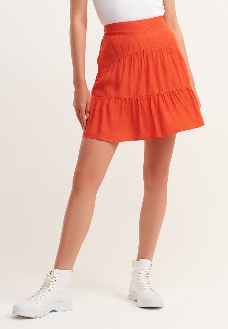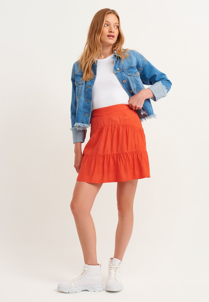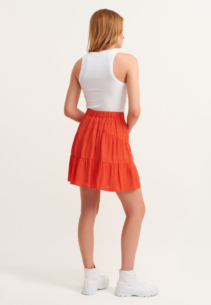 • Bayan Kırmızı Katlı ve Volanlı Mini Etek