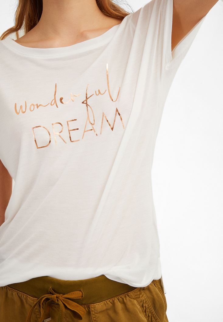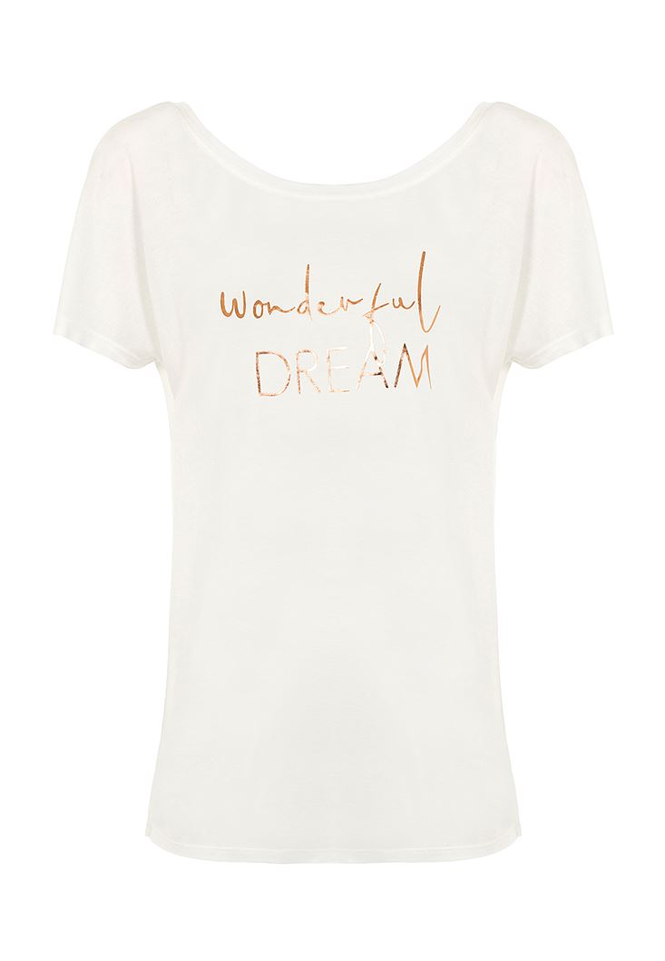 • Bayan Krem Kayık Yaka Baskılı Tişört
