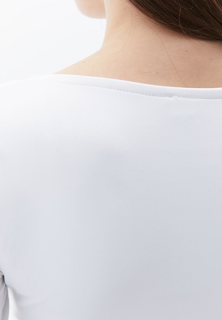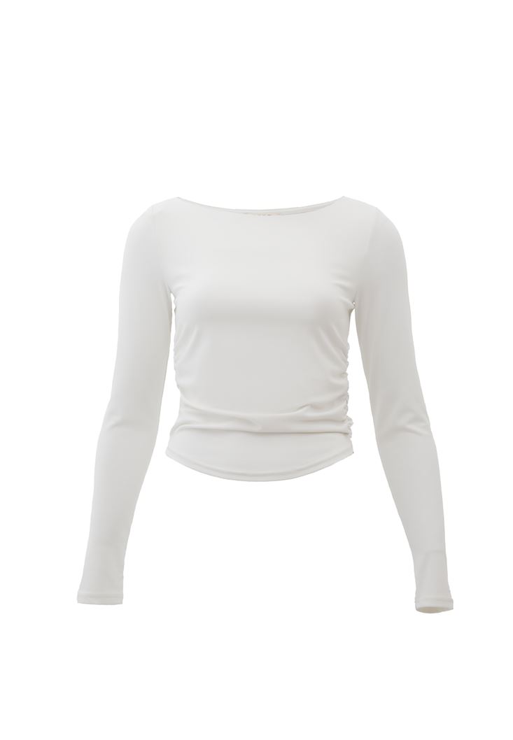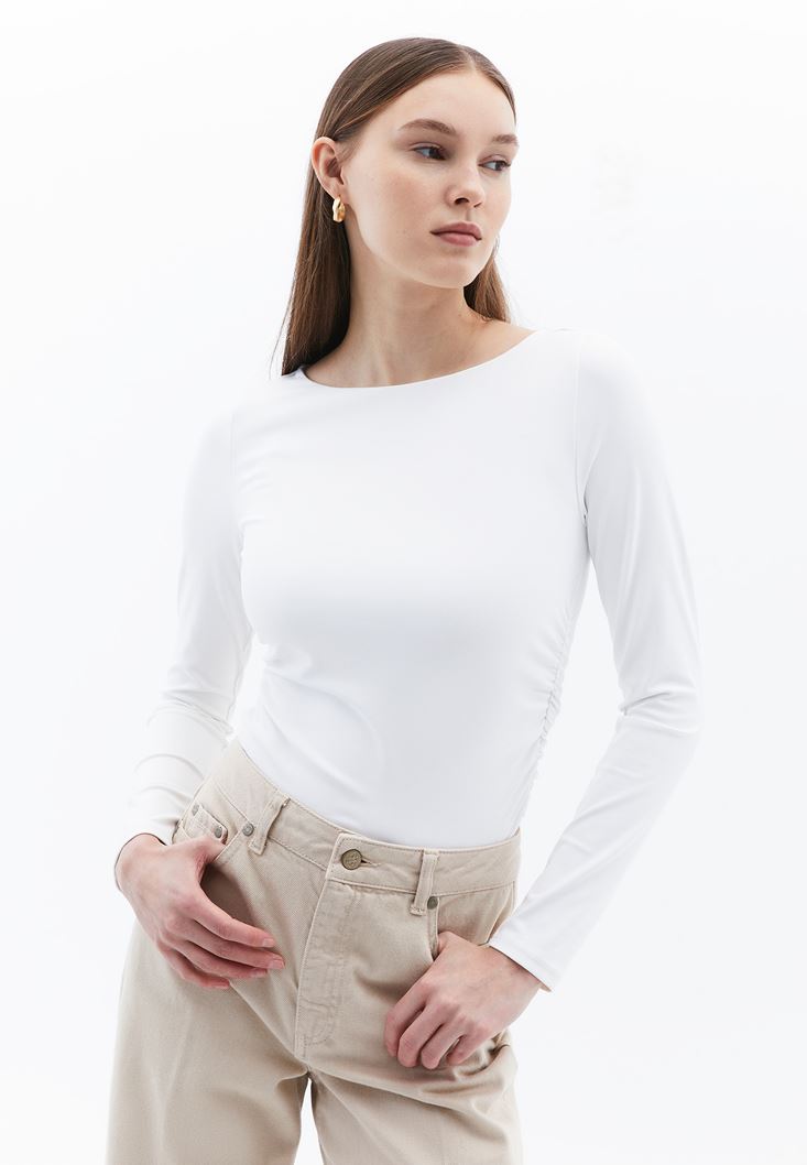 Bedeni saran esnek fit, uzun kollu, yan kısımları büzgü detaylı, kayık yaka, ekstra yumuşak doku.