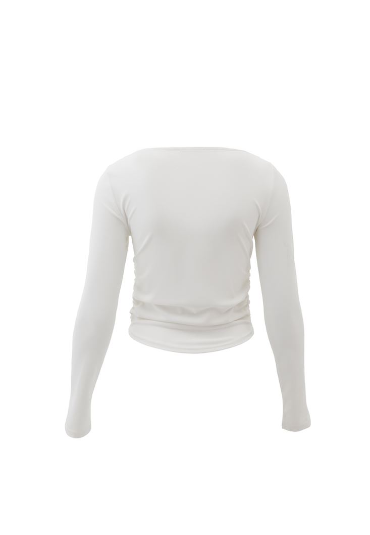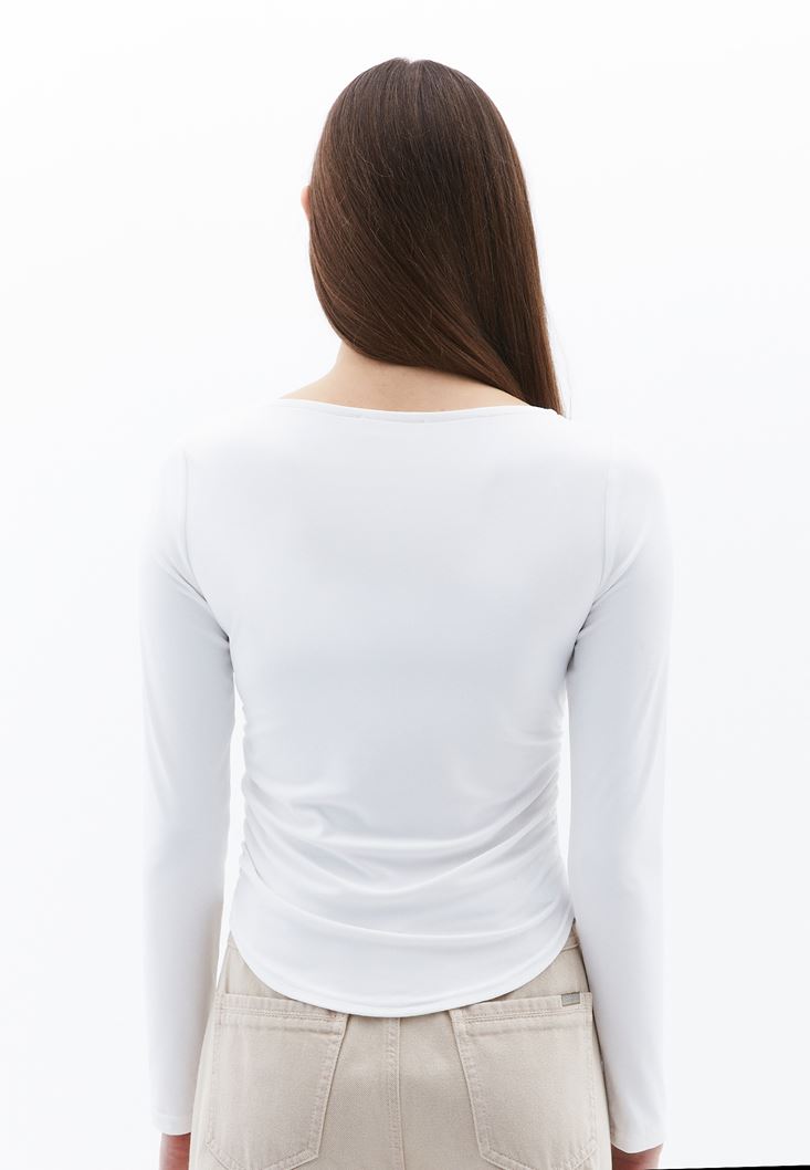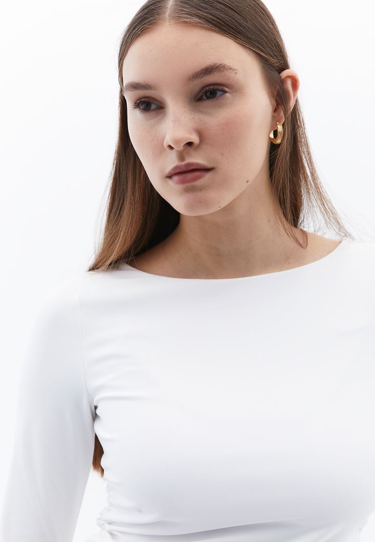• Bayan Beyaz Kayık Yaka Büzgülü Tişört