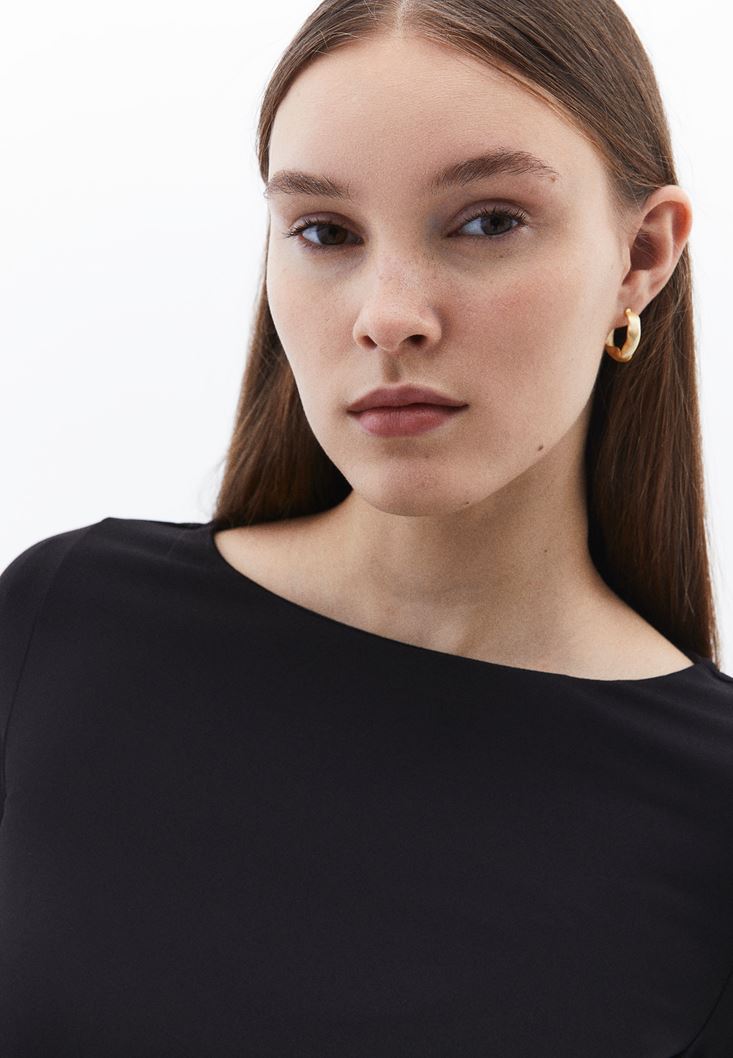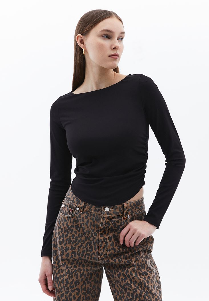 • Bayan Siyah Kayık Yaka Büzgülü Tişört
