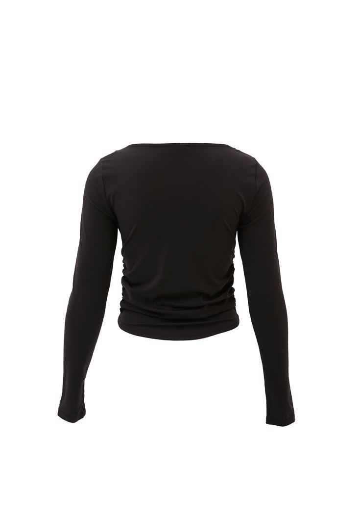 Bedeni saran esnek fit, uzun kollu, yan kısımları büzgü detaylı, kayık yaka, ekstra yumuşak doku.
