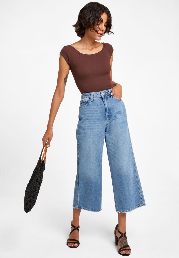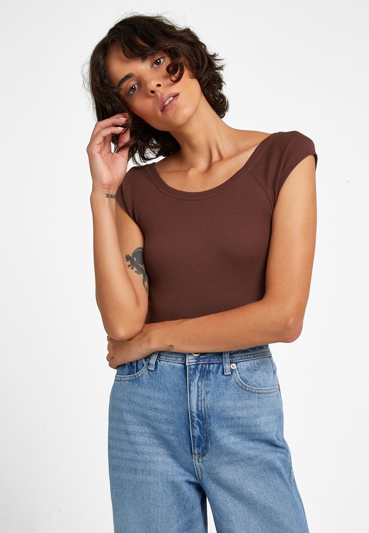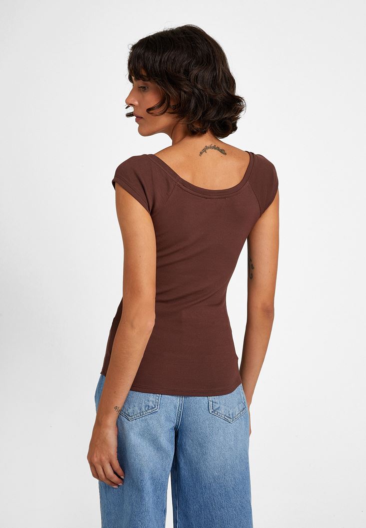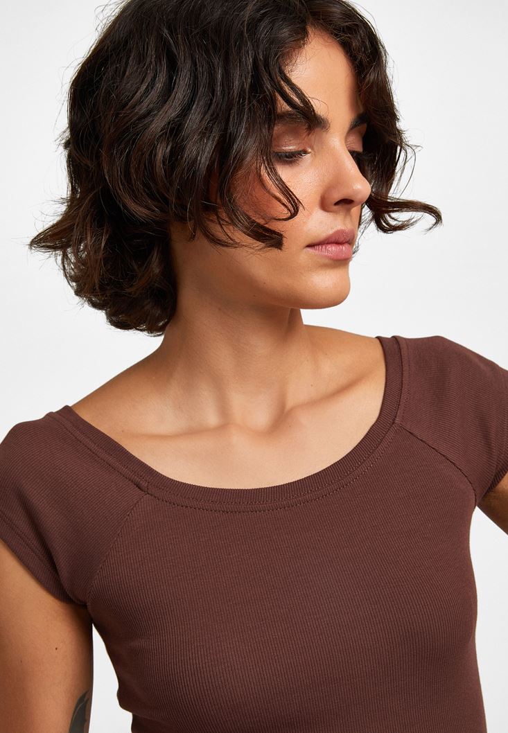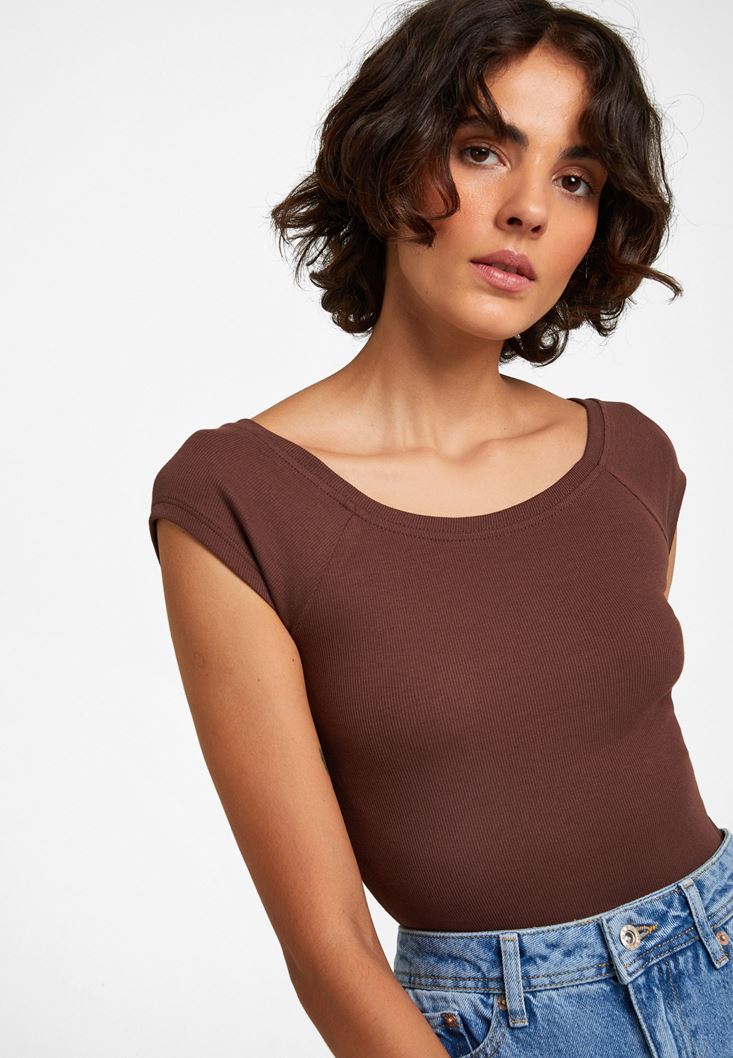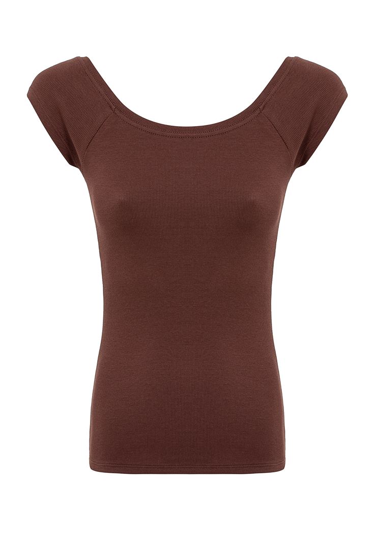 • Bayan Kahverengi Kayık Yaka Kısa Kollu Tişört