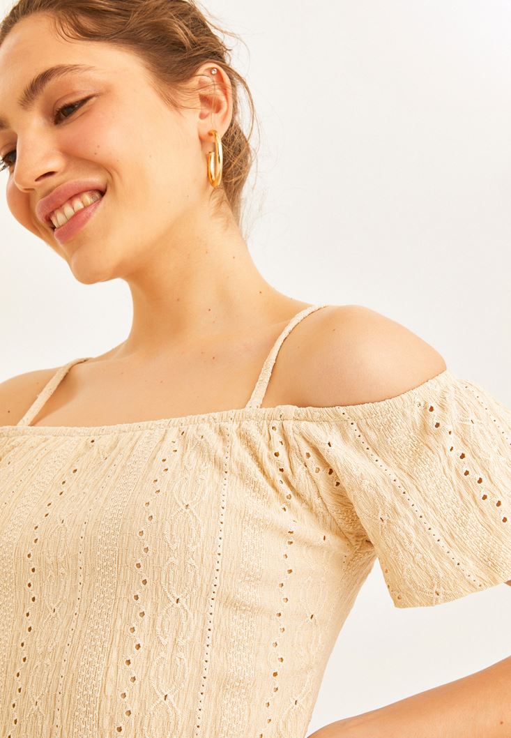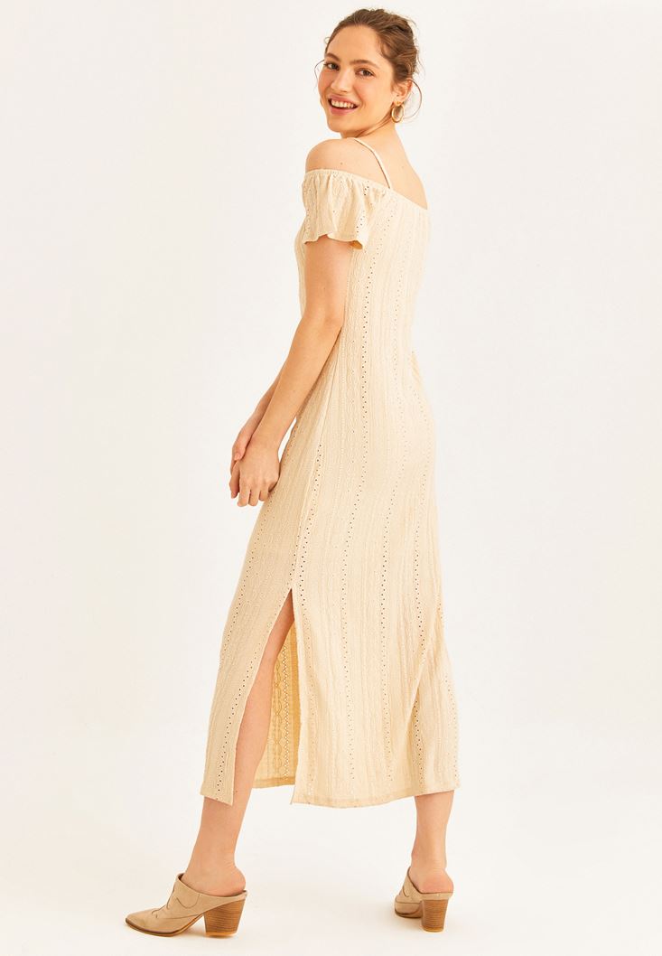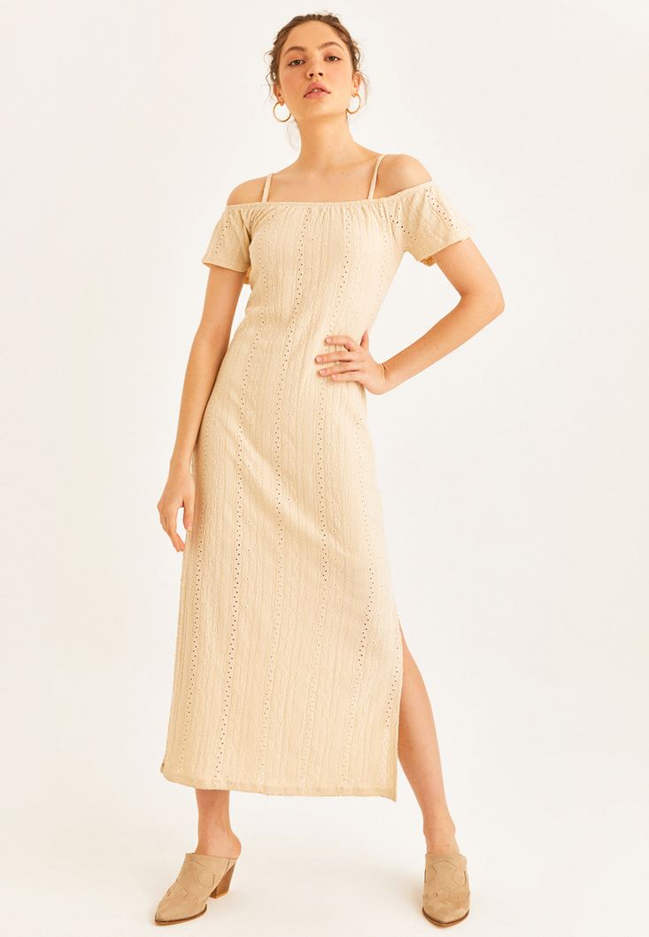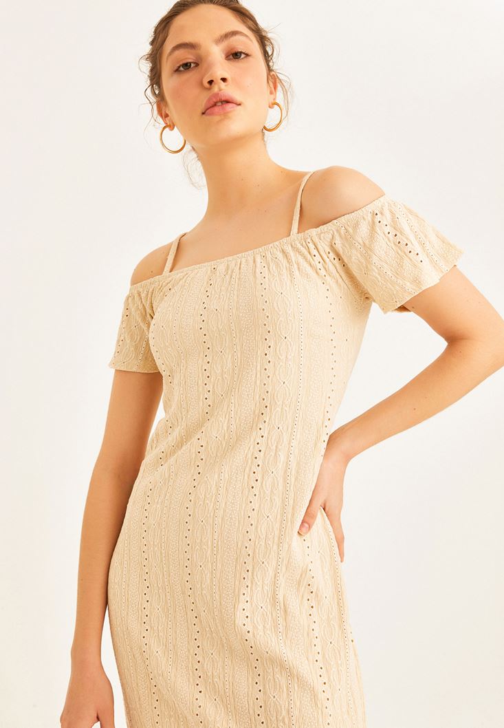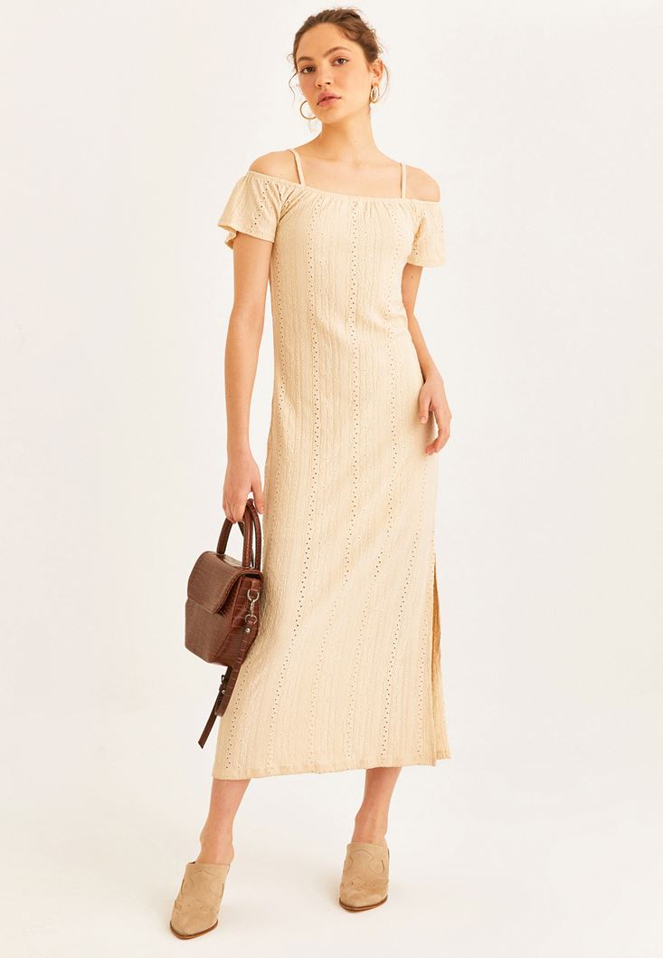 • Bayan Bej Kayık Yaka Midi Boy Elbise