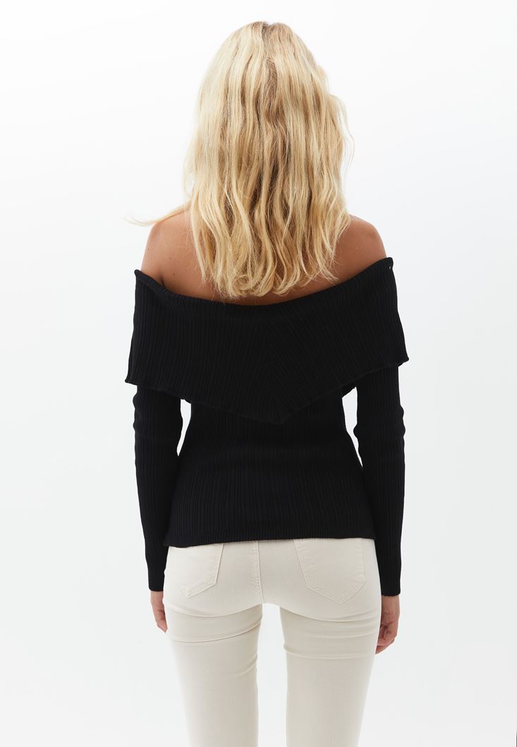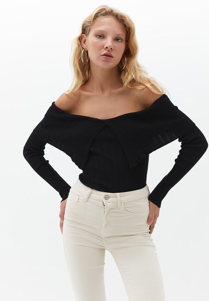• Bayan Siyah Kayık Yaka Triko Kazak