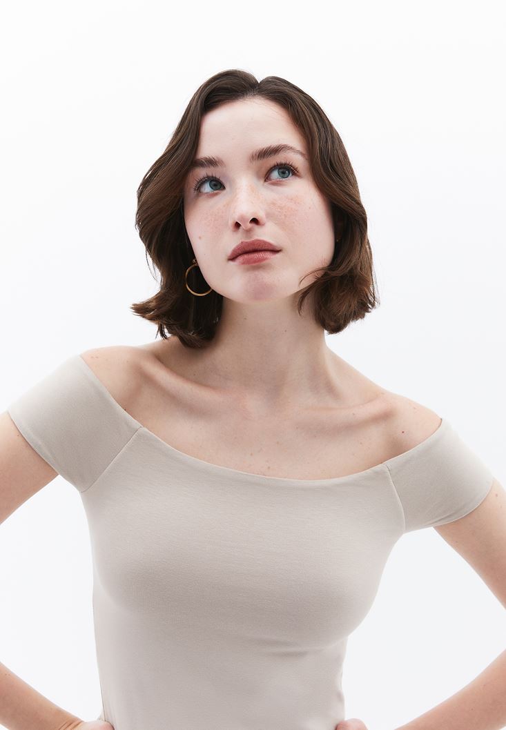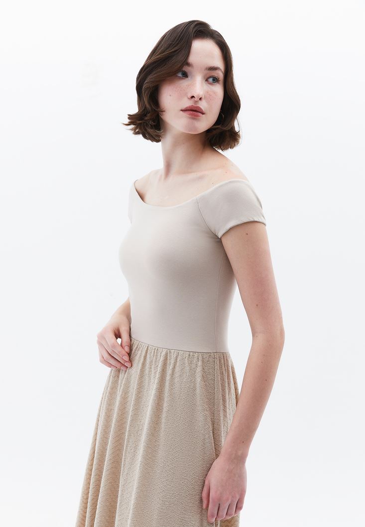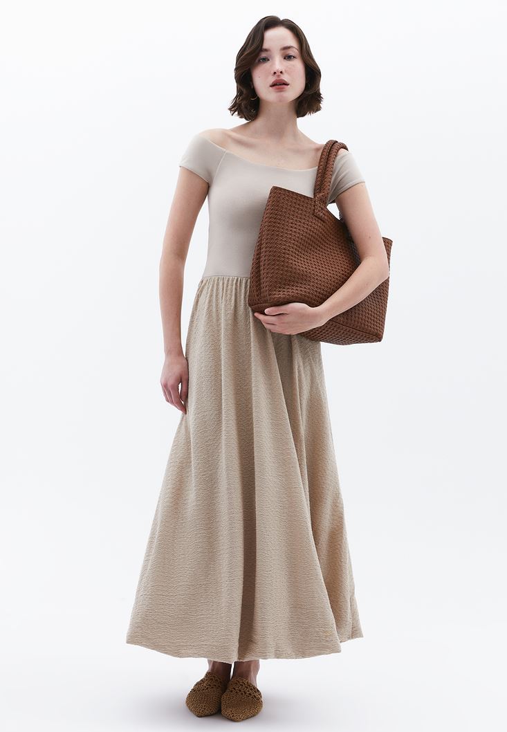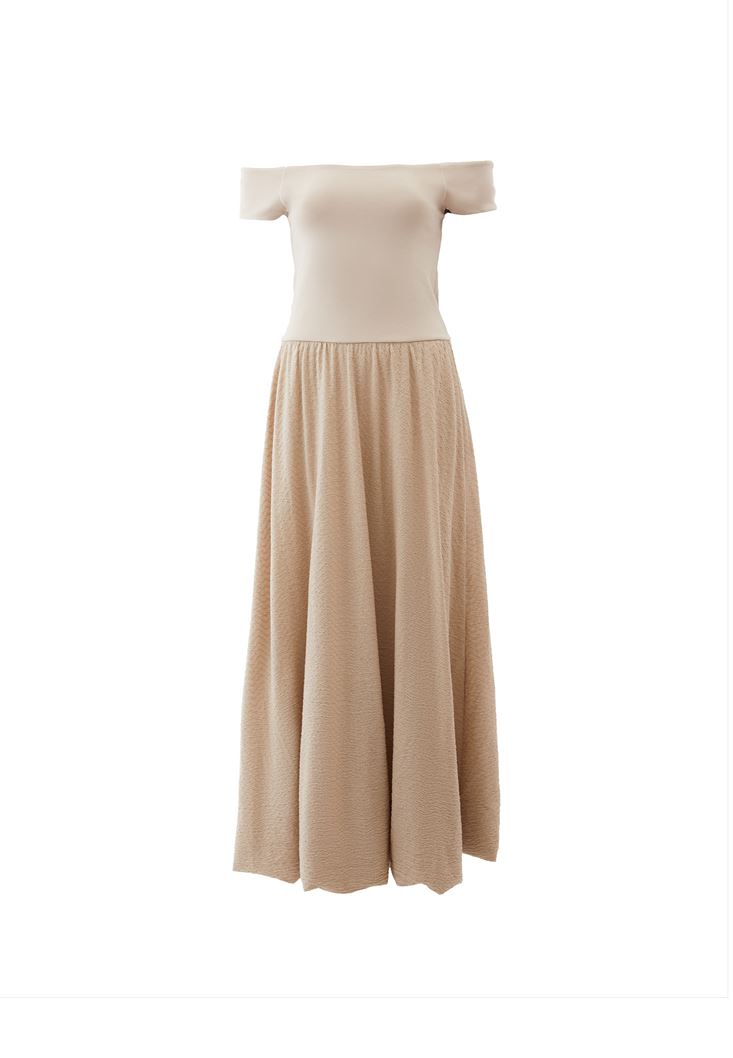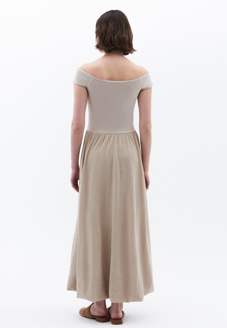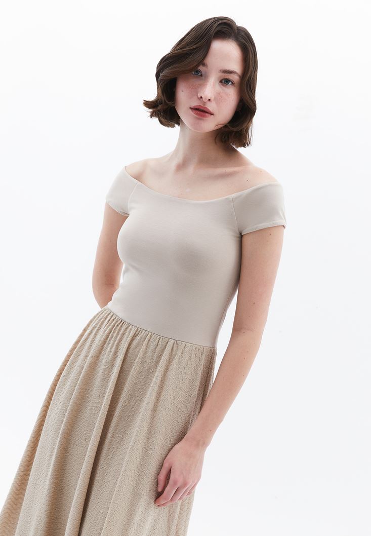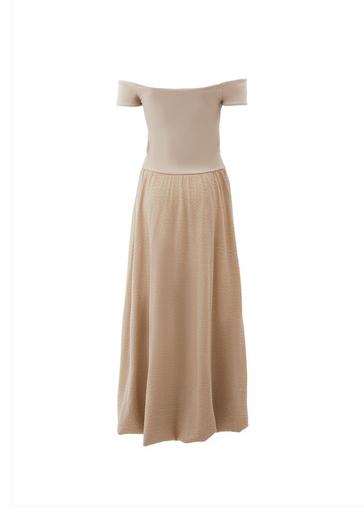 • Bayan Bej Kayık Yaka Uzun Elbise