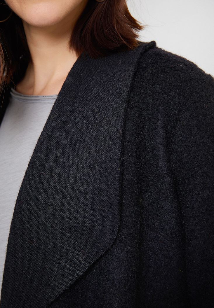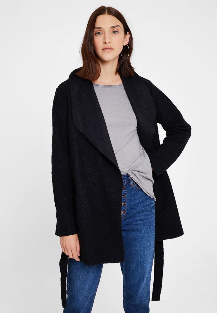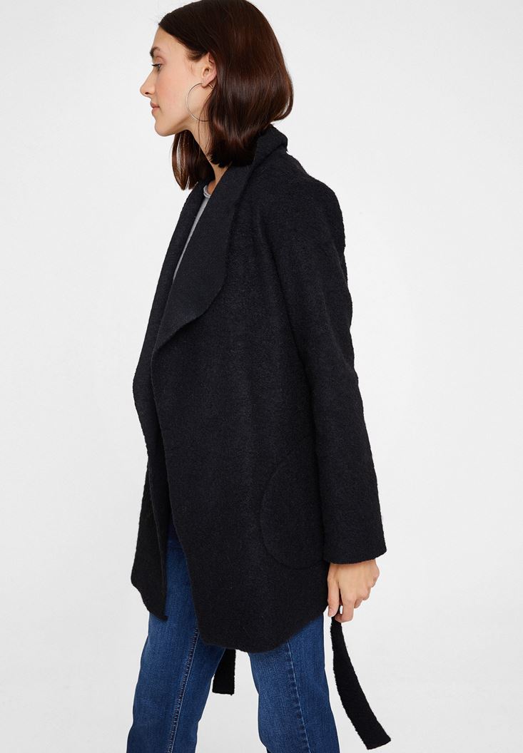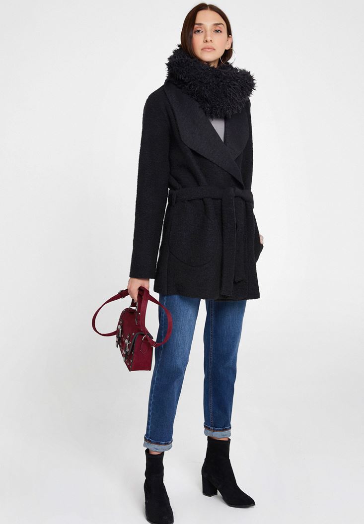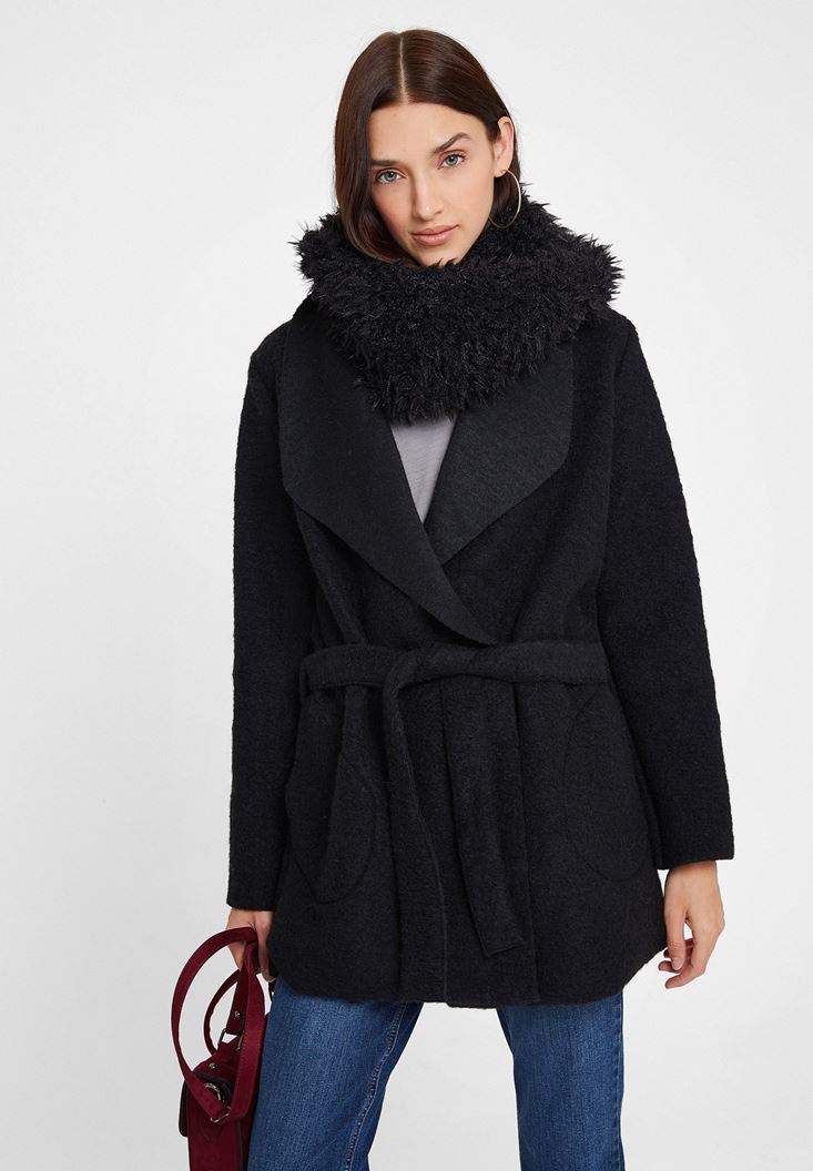 • Bayan Siyah Kemer Detaylı İnce Yün Kaban