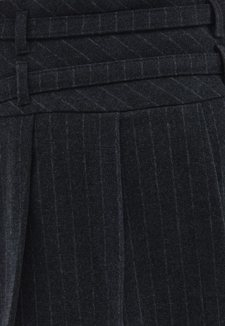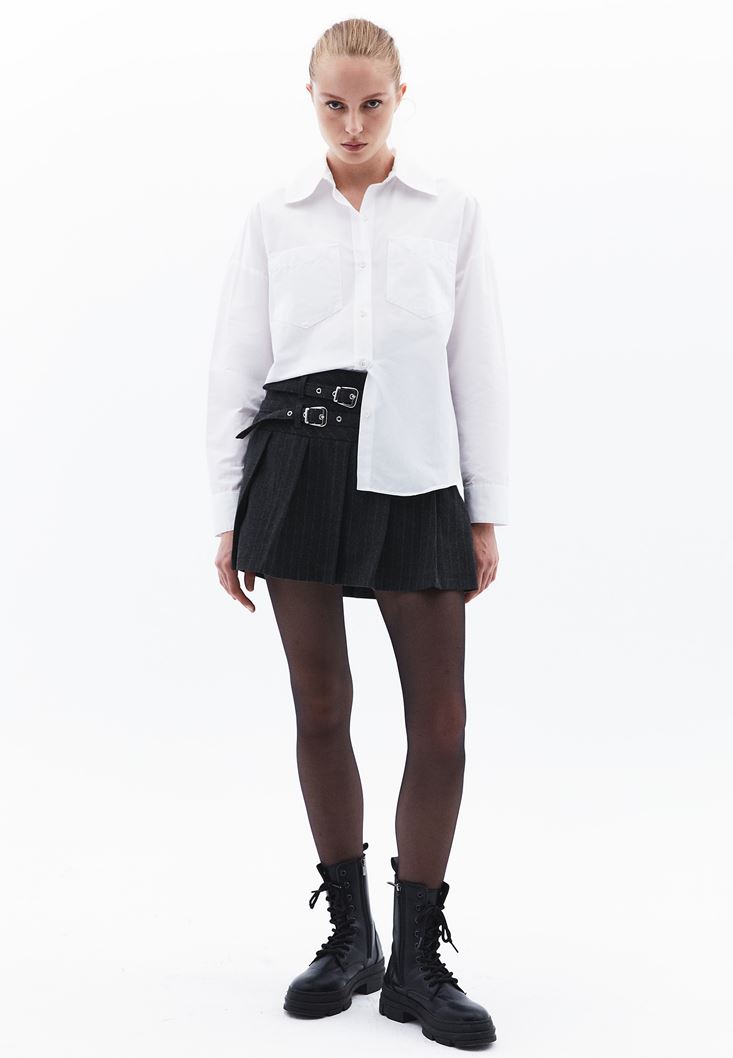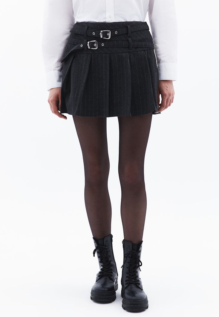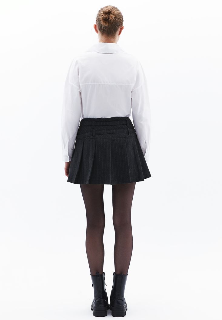 Viskon içerikli doku, çizgi desenli, çift kemer detaylı, yüksek bel, iç kısmı şort detaylı, mini boy, pileli tasarım, a kesim.