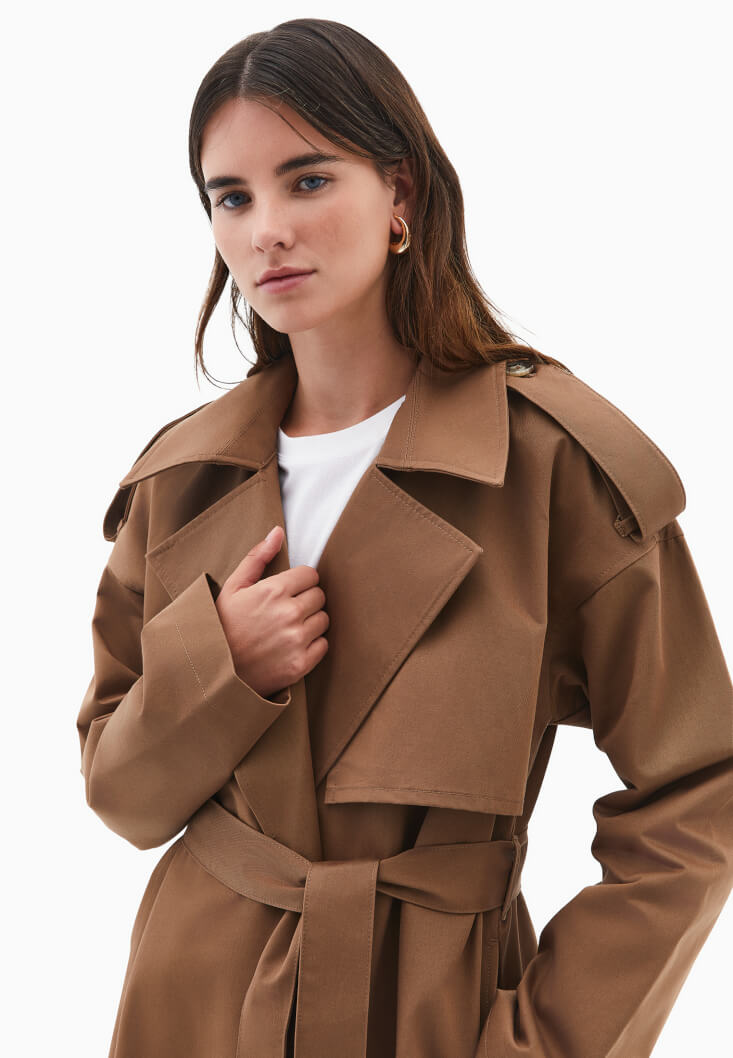 %100 pamuk içerikli doğal doku, bedenden uzak loose fit, kendi kumaşından kuşaklı, düğmeli apolet detaylı, iki cepli, içi astarlı.