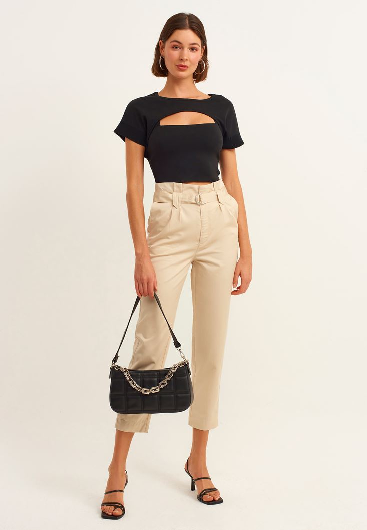 Tencel (Lyocell) ve pamuk içerikli geri dönüştürülebilir içerik, yumuşak doku, kendi kumaşından kemerli, ultra yüksek bel, carrot-fit, slim paça, bel kısmı pileli, önü iki cepli.