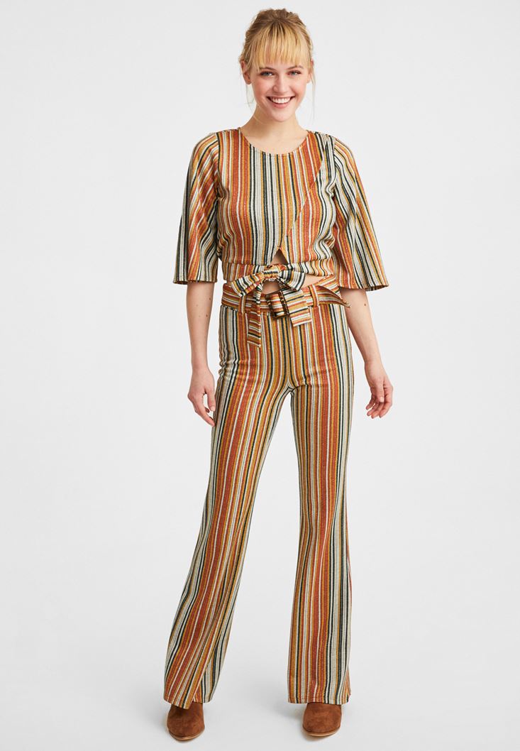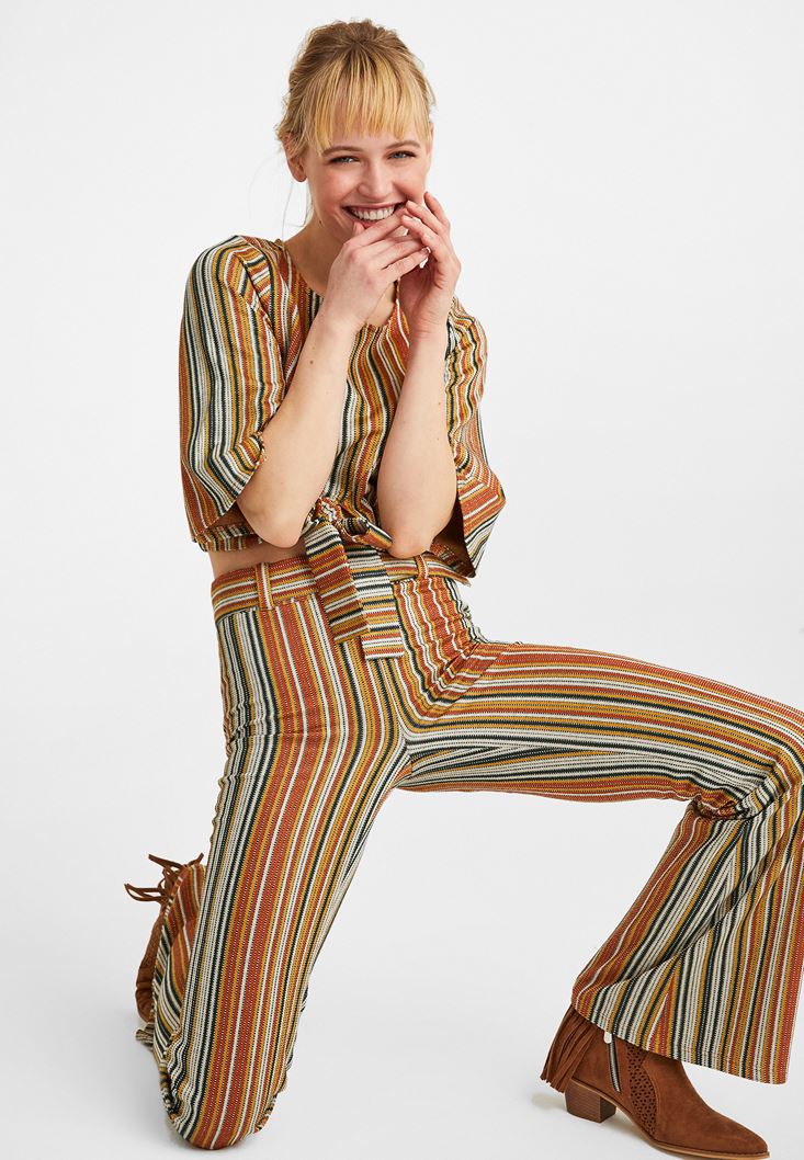 Kemerli Flare Paça Pantolon modeli sahip olduğu yüksek bel kesimi, desen detayları ve vücudu saran yapısı ile her zaman enerjinizi yükseltecek ve hareket özgürlüğünüzü ön plana çıkaracak kadın pantolon modelleri arasında yer alacak. Tasarımın yüksek bel kesimini ön plana çıkaran kemer detayı ve tek geçişli kemer tokası kadın pantolon modeline hoş bir hava kazandırıyor. Dikey çizgi desenleri ile bacak boyunu olduğundan daha uzun gösteren pantolon modeli aynı zamanda bollaşan paça kesimini de başarılı bir şekilde yansıtıyor. Dokusunda yer alan viskoz lifi sayesinde hareket özgürlüğü sunan bu parça viskoz lifinin nefes alan yapısı sayesinde kendinizi her zaman konforlu hissetmenize yardımcı olacak OXXO tasarımlarından birisi.