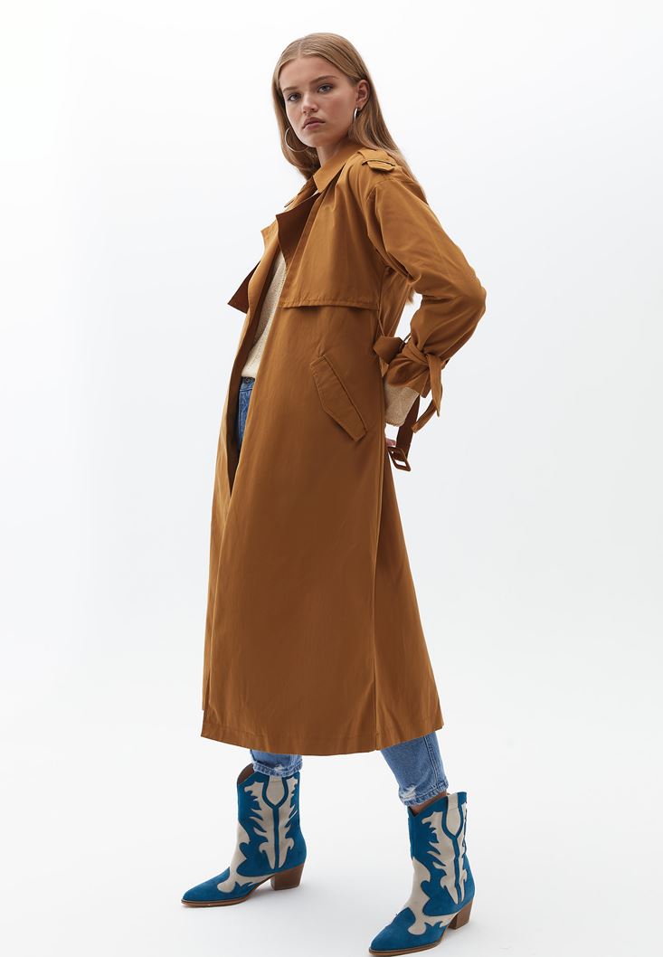 Pamuk karışımlı doku, bedenden uzak oversize fit, uzun boy, kendi kumaşından kemerli, iki cepli, omzu apolet detaylı, kol ucu kemerli, arka kısmı tek yırtmaçlı.
